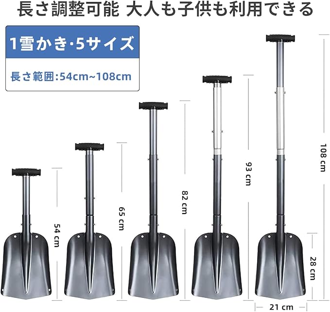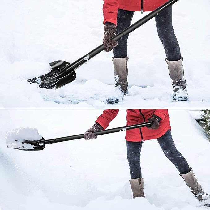 【使いやすい】 除雪シャベルは4つの部分に分かれており、使用シナリオに応じて長さを調整できます。組み立て後の長さは54cm~108cm(大人の肘に近い)で、他のシャベルの長さが80cm(大人の太ももに近い)に比べて使いやすく、腰を痛めにくいです。