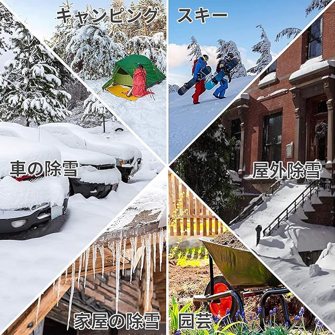 【幅広い使用シナリオ】 車両、住宅、庭、庭園、歩道の除雪に適しています。雪のない日には、台風や大雨による被害の片付けに使用でき、キャンプ、ハイキング、登山などのアウトドア活動にも使用できます。