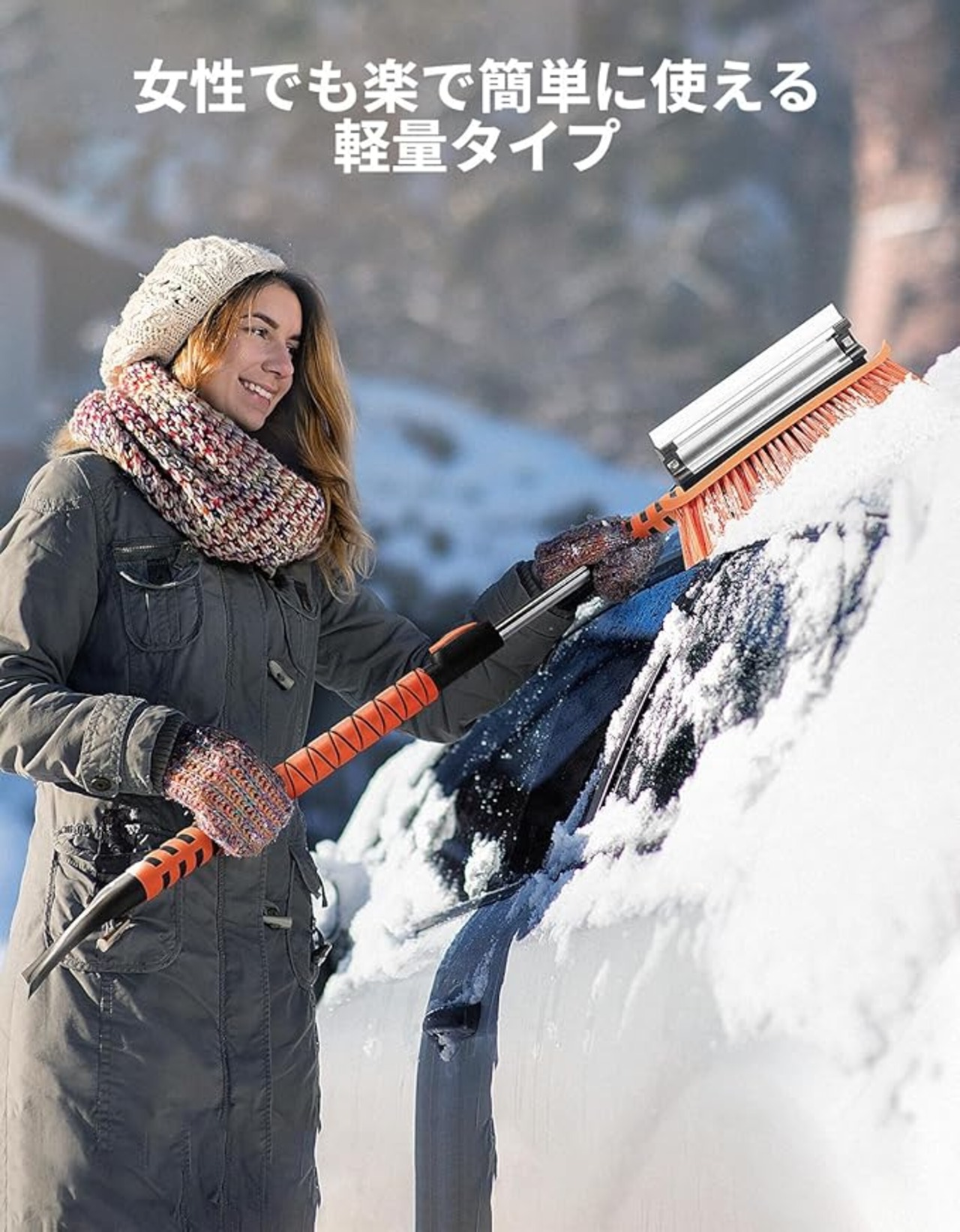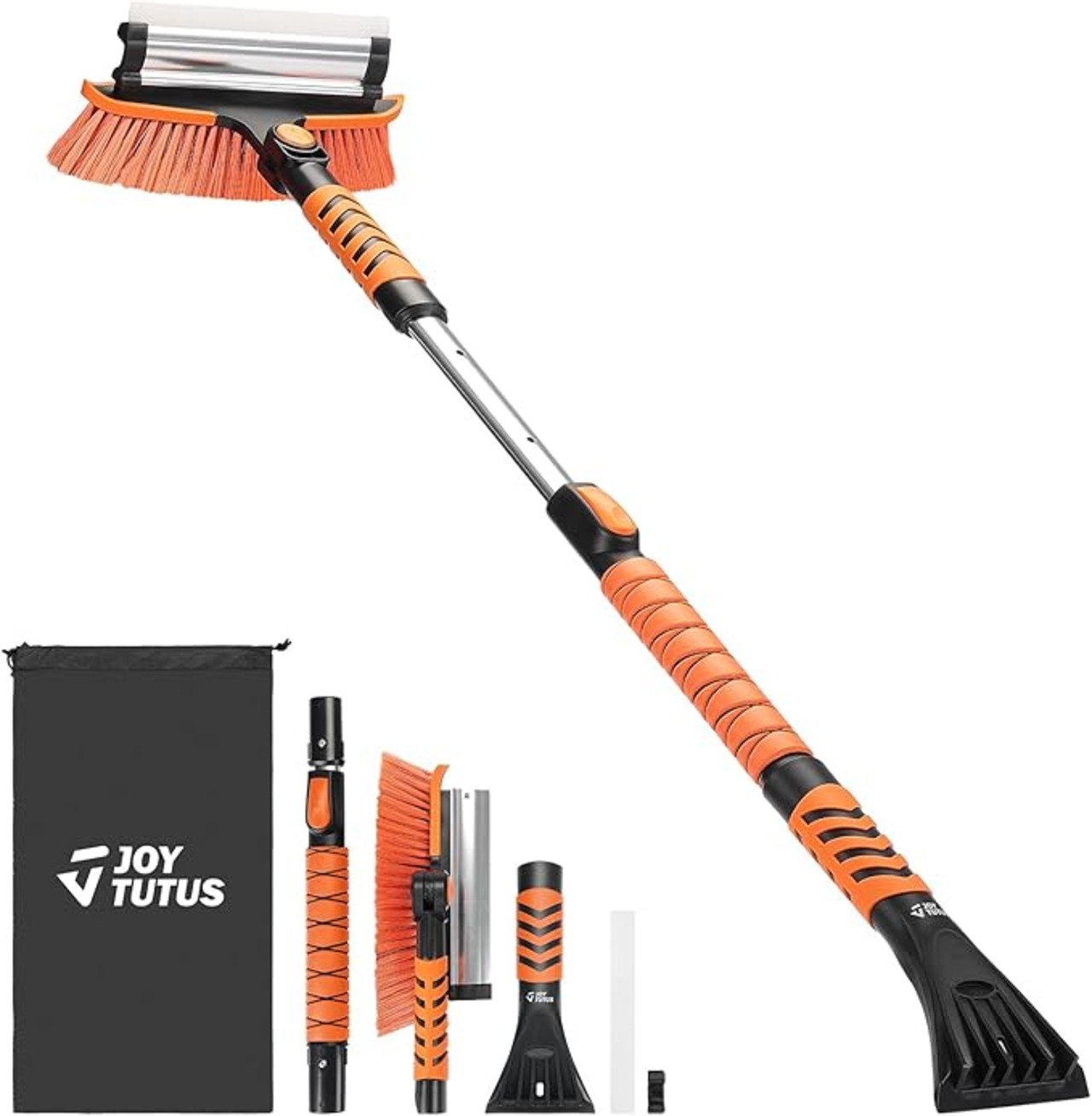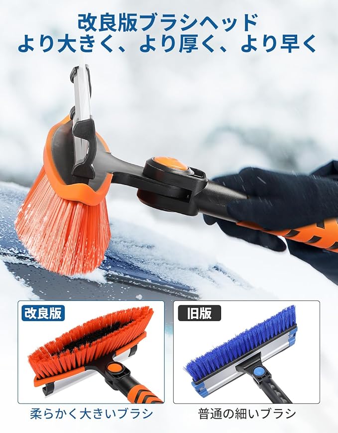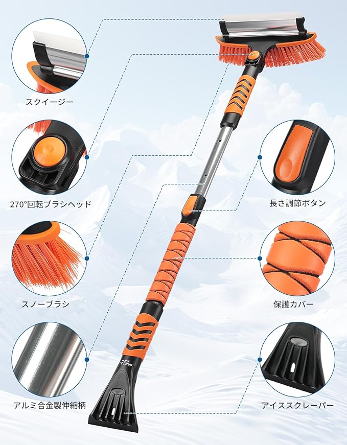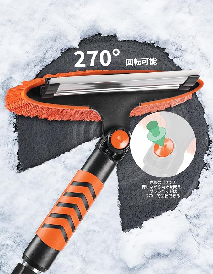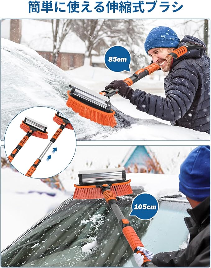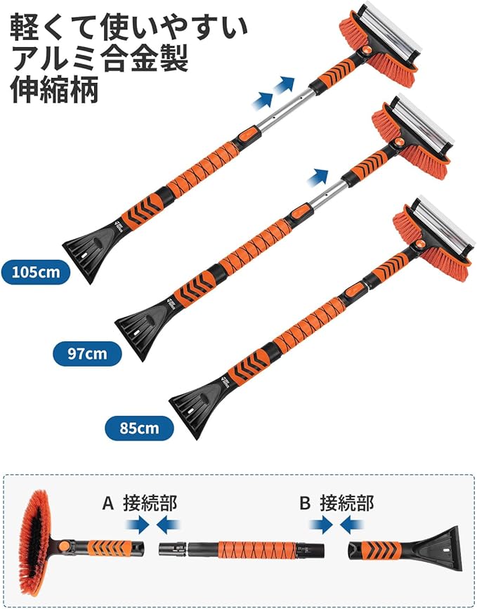 【85-105cm】 JOYTUTUS 車 スノーブラシ 伸縮 除雪ブラシ コンパクト収納 車用 アイススクレーパ付き 連結式 折りたたみ 雪対策 ベタ雪用 ヘッド調整可能 SUV対応 オレンジ