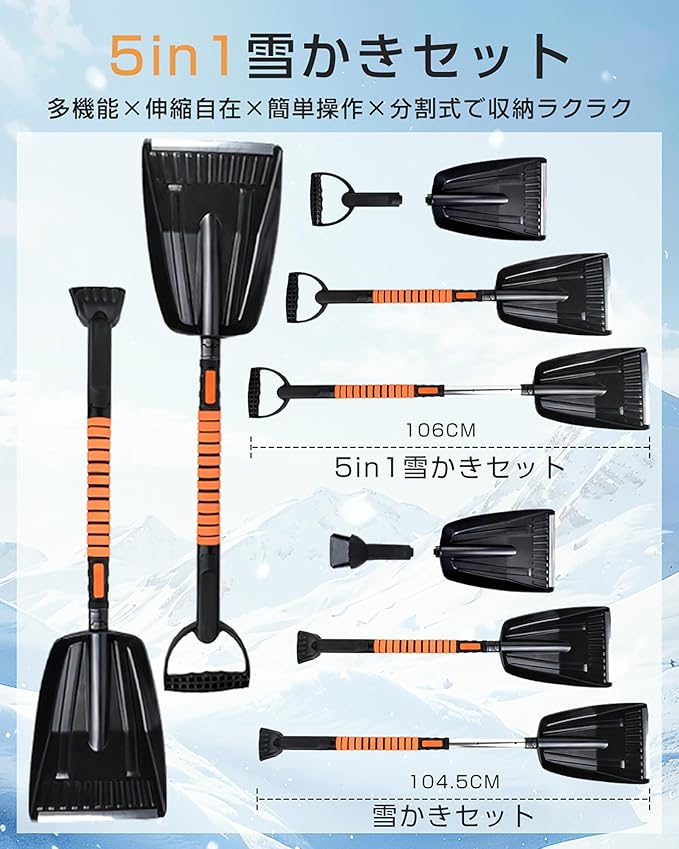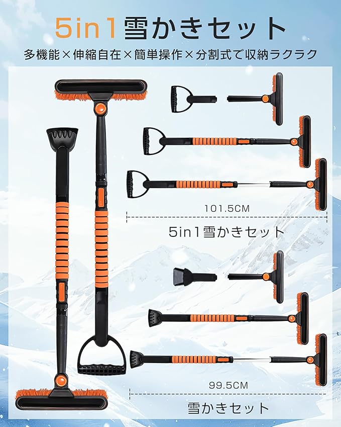 スノーブラシ 除雪ブラシ 车用 5in1 多機能 雪かきスコップ アイススクレーパー 79.5-106cm長さ調節可能 車用スノーブラシ 除雪ブラシセット 組立簡単 雪対策 360 回転可能 軽量 フロントガラス用 EVAフォームグリップ (自動車/トラック/SUV用)