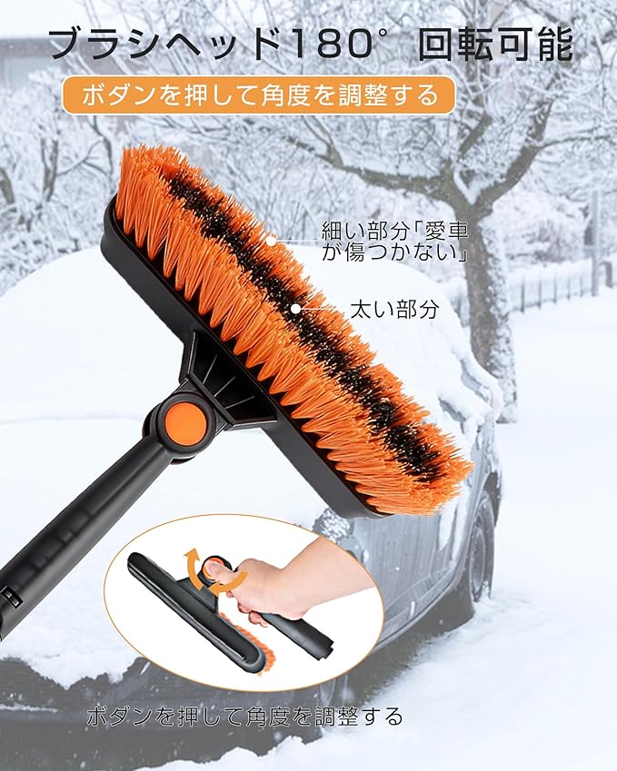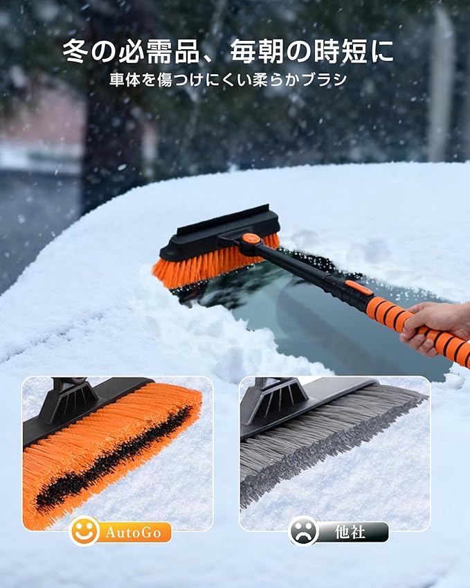 ❄️【360 回転ヘッドで効率的に除雪】除雪ブラシ部分は360 回転でき、ルーフやフロントガラス、ボンネットなど角度を変えながら楽に操作できます。 柔らかく密度の高い毛先が車の塗装を傷つけず、しっかりと雪を払い落とします。 AutoGoスノーブラシは軽量ながら耐久性に優れ、車用スノーブラシとして長くお使いいただけます。