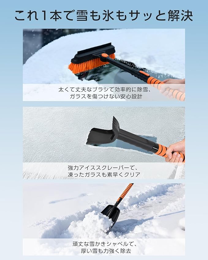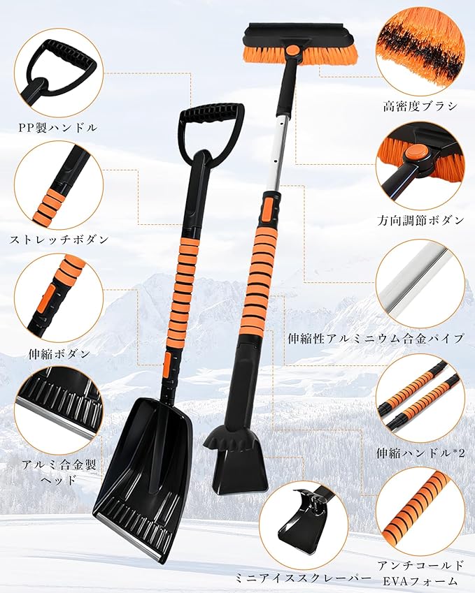【伸縮式ハンドル&滑り止めEVAグリップ】伸縮スノーブラシ&スコップは79.5cm〜106cmまで8段階に長さ調整可能。 SUVや大型車の屋根まで無理なく届き、効率的に除雪ができます。 アルミ合金製ポールは軽量で丈夫、EVAフォームグリップは滑りにくく、寒い冬でも快適な握り心地を実現。 長時間の除雪作業も疲れにくく、しっかりとしたグリップ力で安心です。