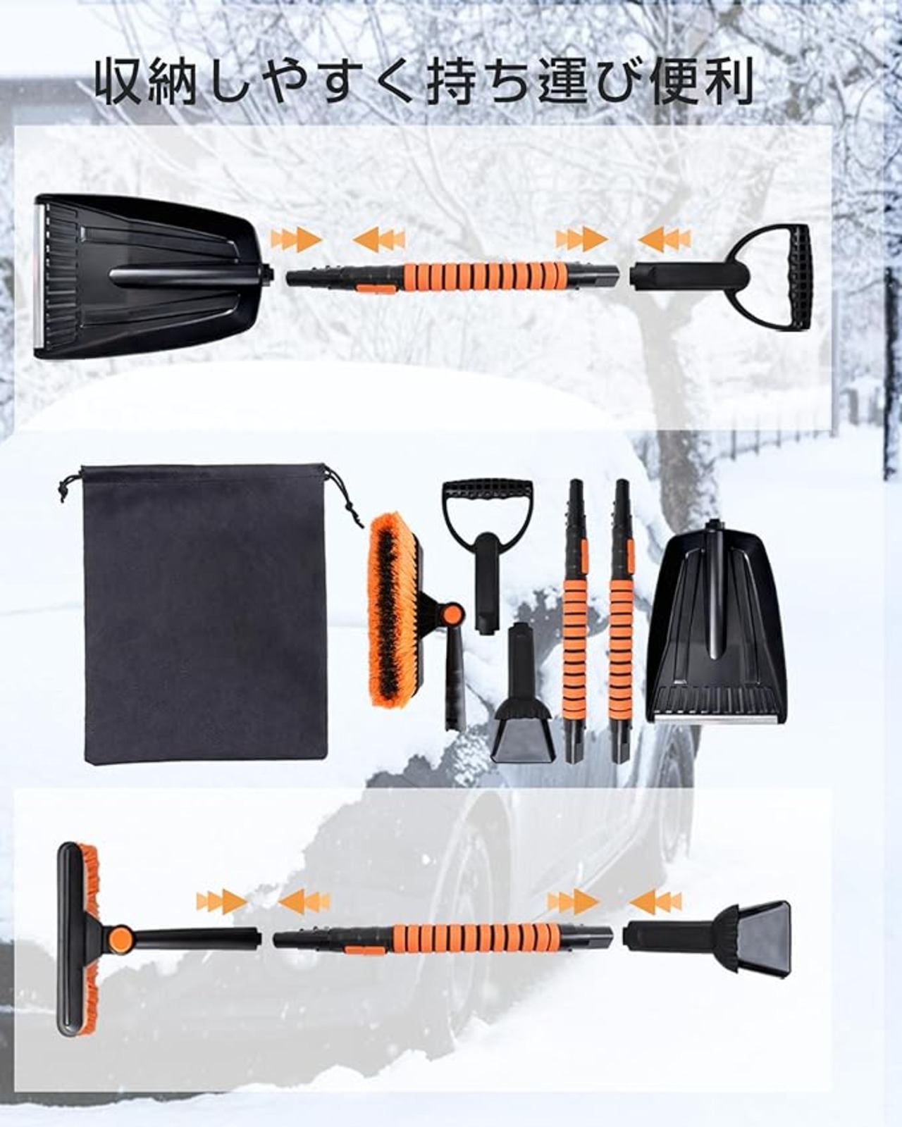 【分解収納・持ち運び簡単】AutoGoスノーブラシ&スコップは、ブラシ・ポール・アイススクレーパーの3パーツに簡単分解可能。 付属の収納バッグにまとめて入れられ、車のトランクや座席下にもすっきり収納できます。 携帯性に優れた設計で、急な積雪や出先での除雪にもすぐ対応できる頼もしい車用スノーブラシです。