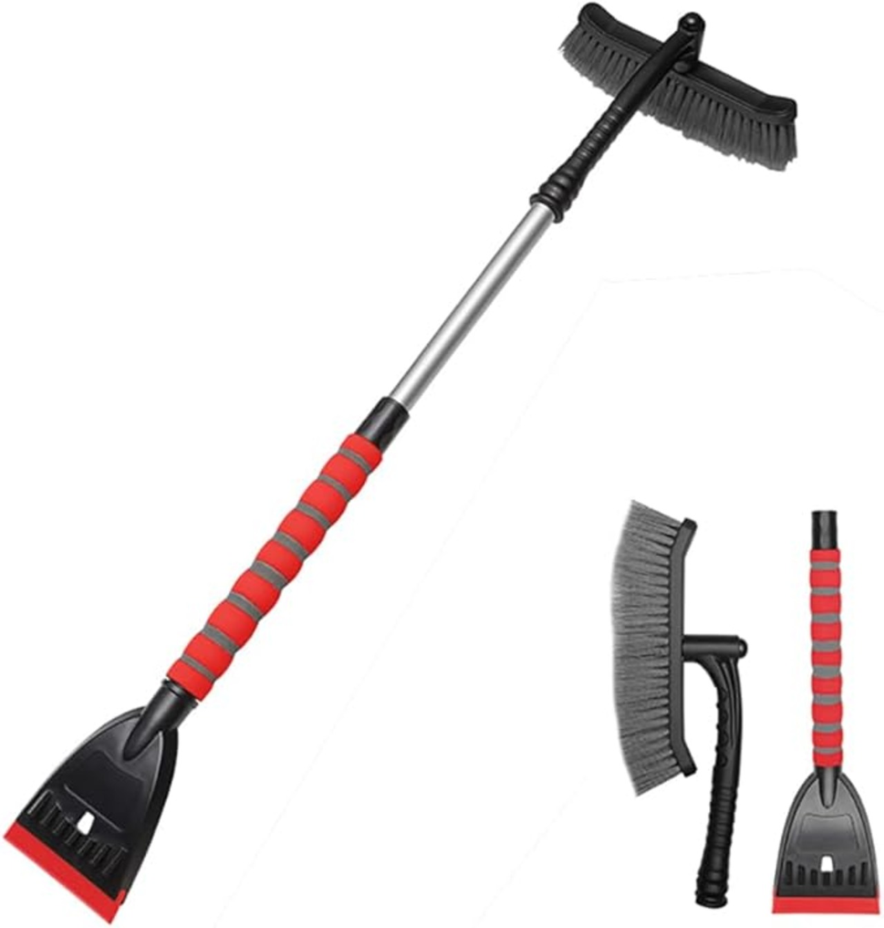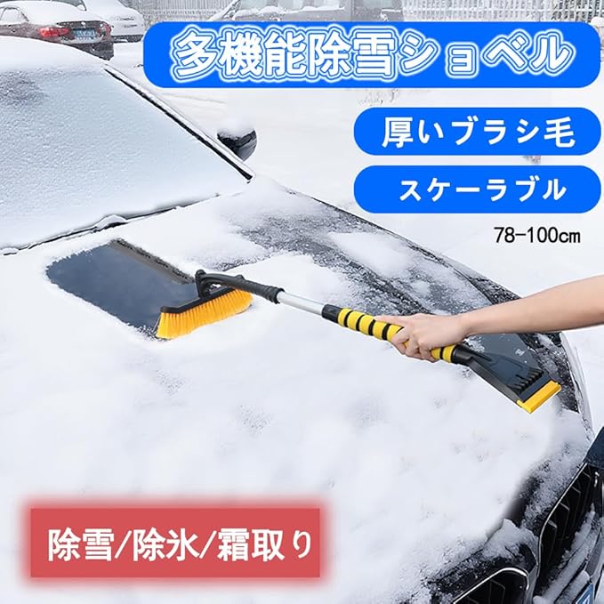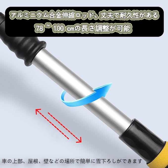 雪かきブラシは、ブラシヘッド、棒、氷かきの3つの部品に分解することができる。伸縮棒はアルミ素材で、折れにくい。伸縮棒のボタンを押すだけで長さ(78~100 cm)が調節でき、フロントガラスや屋根の雪も容易になる。