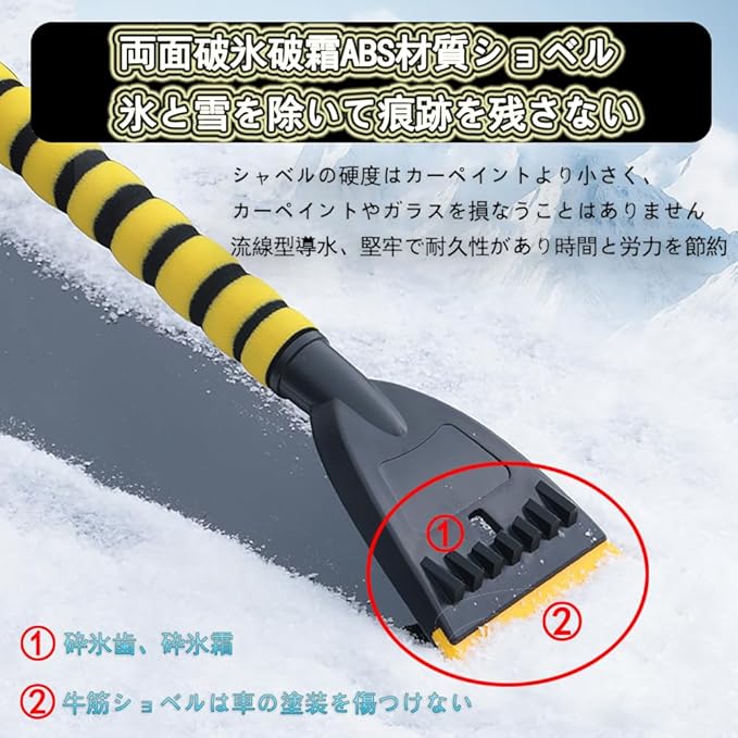 360 回転可能なブラシヘッドは柔軟で効果的な除雪作業を実現でき、フロントガラスや全車に使用できる。C形状のアイスドクターにはドクターブレード側とシャープな部分があり、分厚い氷でも効果的に取り除くことができます。
