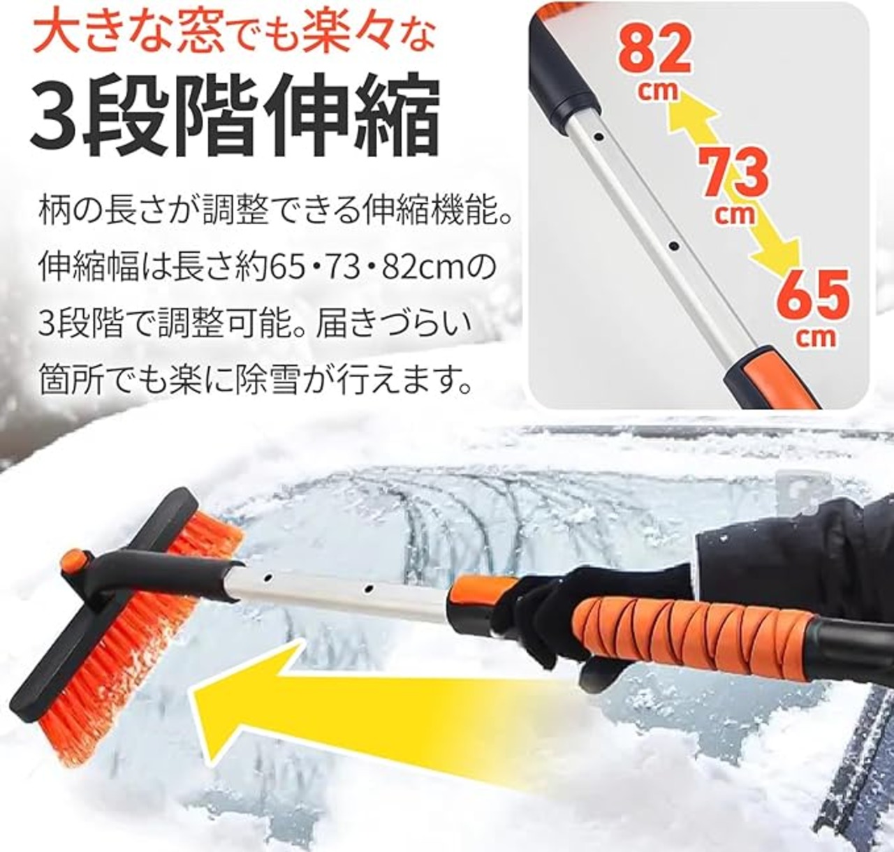 3段階長さ調整が可能で、約65/73/82cmに伸縮できます。大きなフロントガラスなど届きにくい場所でも除雪が楽に行えます。