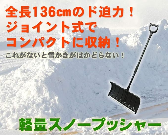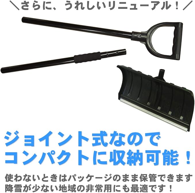 突然の雪に!軽量で扱いやすいスノープッシャーです。先端は金属製の強化ブレード付きで、柄はしっかりしたジョイント式のスチール製のパイプを採用。ネジ留めによるかんたん組み立て式で、不要な時期などコンパクトに分解することも可能。【改良しました】2021年12月入荷分より、柄のパイプをより厚手のものに変更・強化しました(0.5mm→0.8mm)