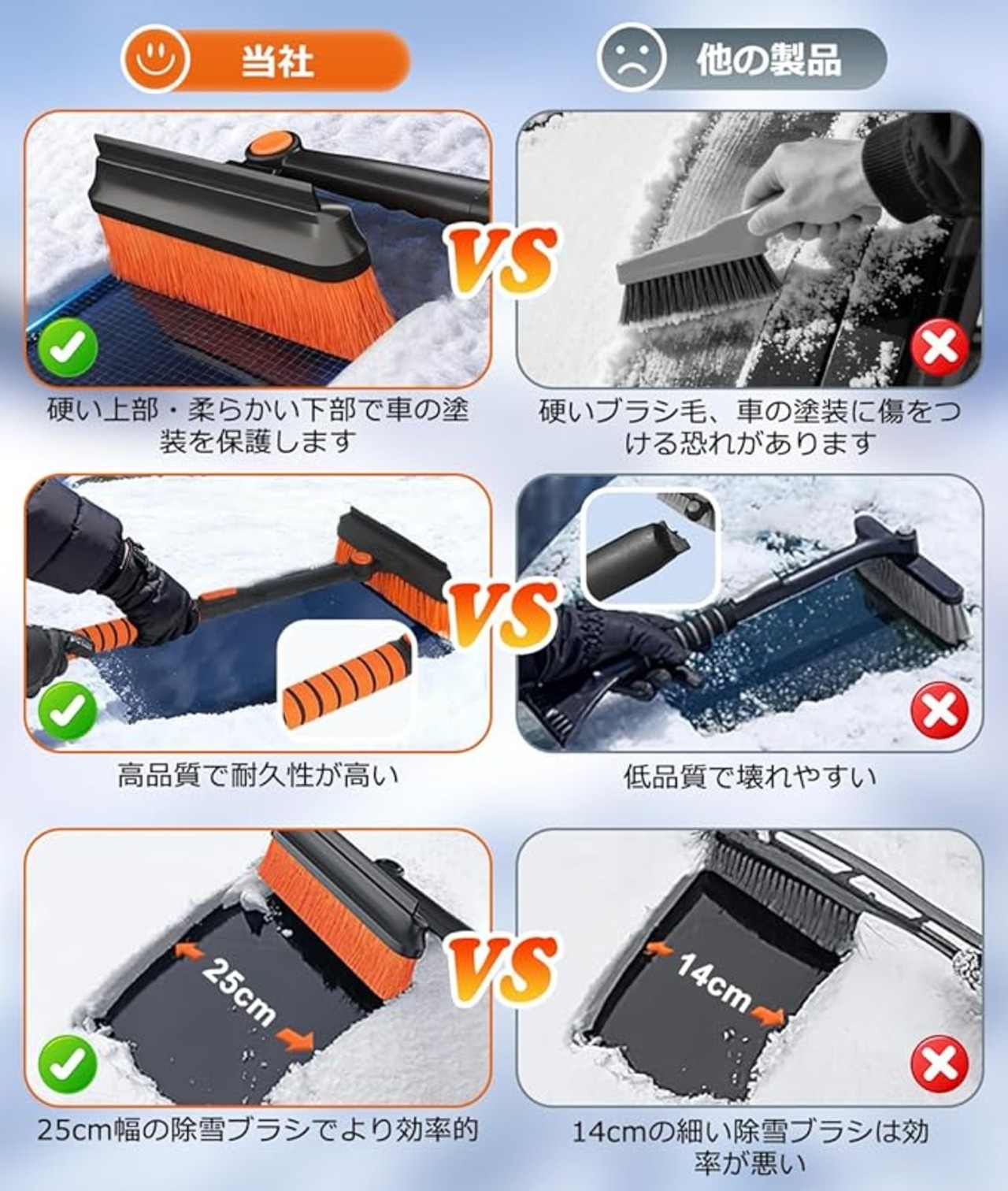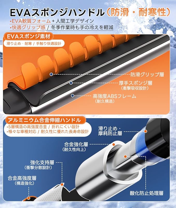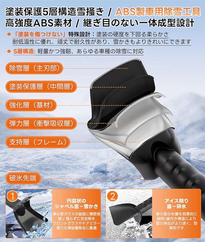 【特別設計】5層厚の高品質雪かきシャベルヘッドを特別処理され、車体に傷を付けません;スノースクレーパー幅を従来品より広く設計され、霜取りで削ぎ落とす事が楽になります;全体が高強度で耐低温のABS素材を使用され、低温な環境でも耐久性が素晴らしい。 冬の嵐の後、このシャベルを使うと、雪を早く、簡単に取り除くことができます。安全かつスムーズに通行できるように、歩道や車道を除雪する際に、腕や腰に負担がかからないように設計されています。