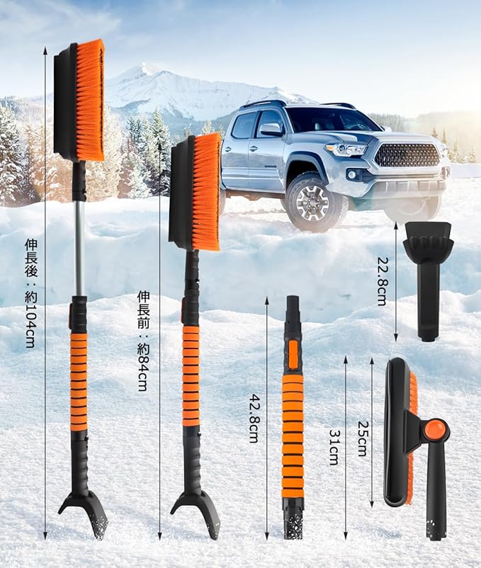 【規格】組み立て後寸法:最短:84 cm、最長:104 cm。重量:約580 g(収納時はコンパクトで持ち運びしやすい)三合一の設計で、雪かきブラシと雪かきを変えて、さまざまな環境で使用することができます。