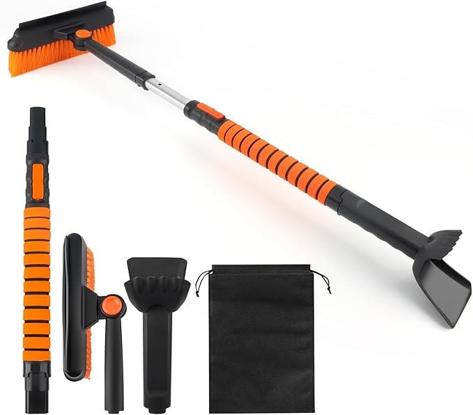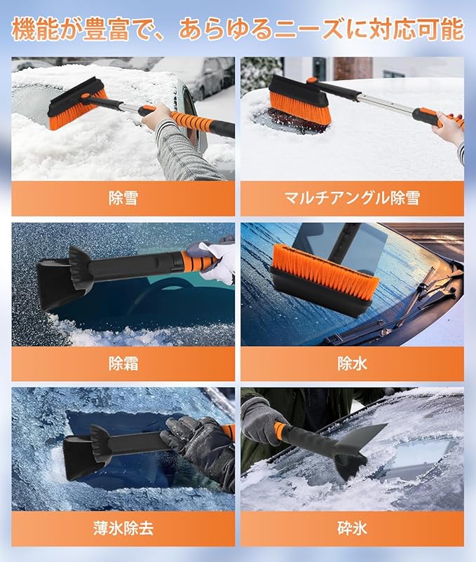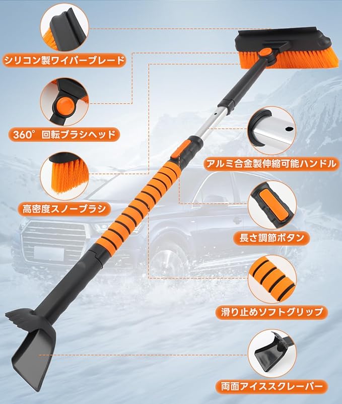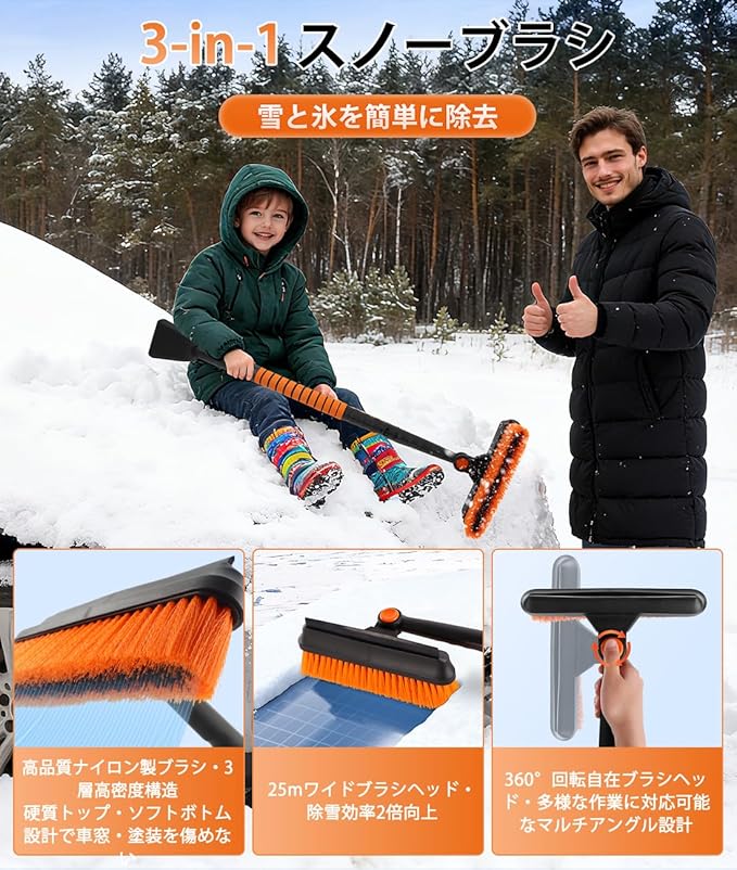 スノーブラシ スノースクレーパー アイススクレーパー 3 in 1 多機能 ブラシヘッド360 回転 伸縮式アルミハンドル 調節長さ84cm-104cm 除雪ブラシ 除雪 除霜作業 車 傷つかない 車 雪かき 車 雪下ろし 車用 霜取り 冬 雪対策 軽量 着脱可式でコンパクト収納 自動車 トラック SUVに対応