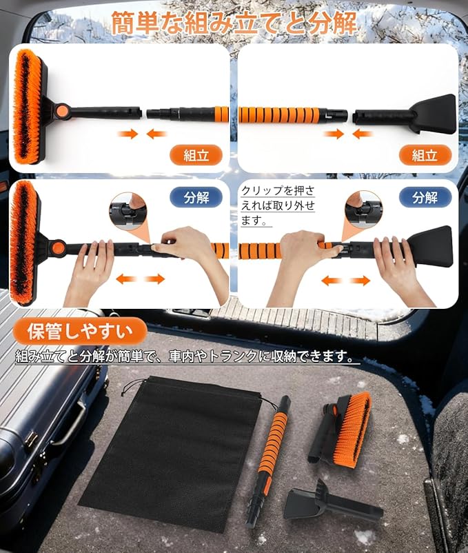 【ワイドブラシヘッド&ローテーション設計】幅25cmのブラシヘッドは、除雪効率を大幅に向上させます。ボタンを押すだけでブラシヘッドが360 回転し、隅々まで雪を取り除き、車体表面や窓の雪を簡単に除去します。組み立てと分解が簡単で、車内やトランクに収納できます。