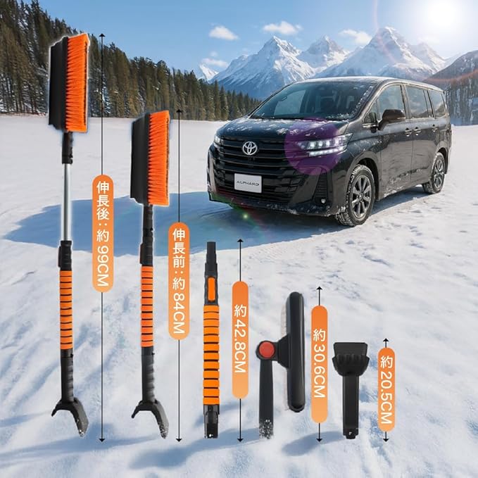 スノーブラシ 車 除雪ブラシ 雪かき 6 in 1 多機能 車用スノーブラシ 雪対応 アイススクレーパー 伸縮式アルミハンドル 雪対策自動車 トラック SUVに対応 スクイージ 収納パック付き