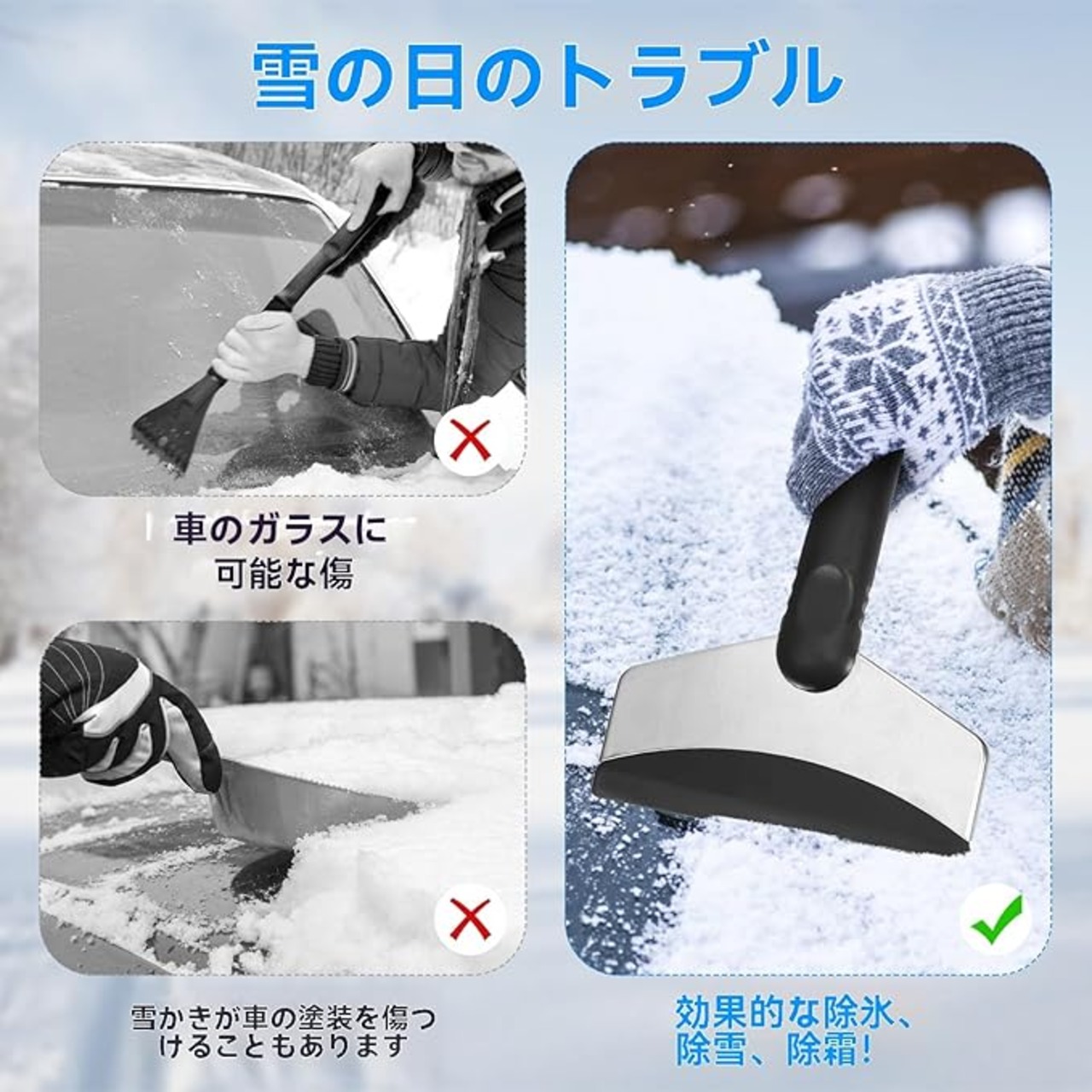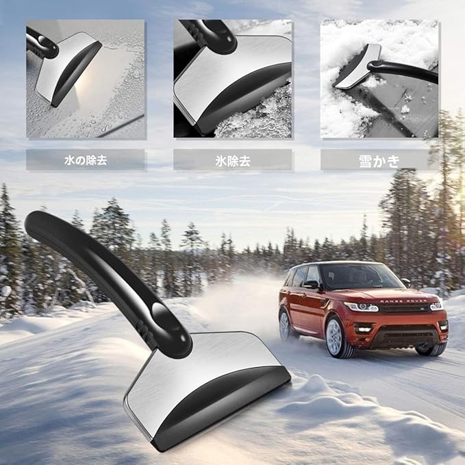 除雪作業のほか、通常の氷、霜、水、土等も除去でき、自動車のメンテナンスとか洗車の常備工具になれます。