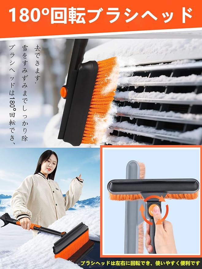 【回転式ブラシヘッド】27.5cmのワイドブラシヘッドで広範囲をすばやく掃除できます。ブラシヘッドは180度回転し、溝やグリル部分の雪も簡単に取り除くことができ、死角がありません。