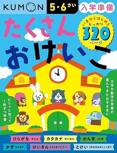 ひらがな、カタカナ、漢字、かず、たしざん、とけいの読みかたの練習が1冊でできます。