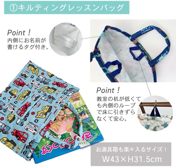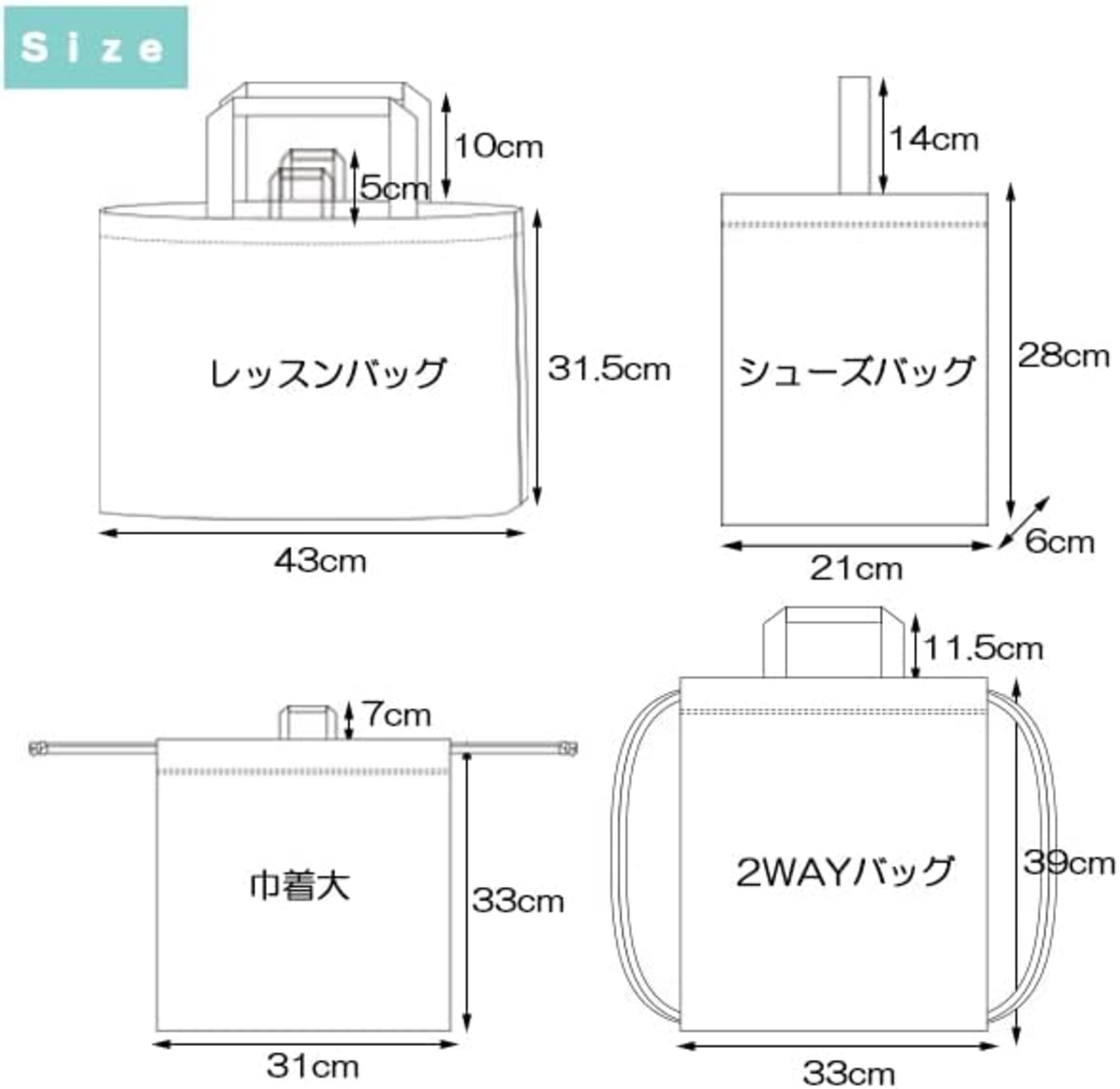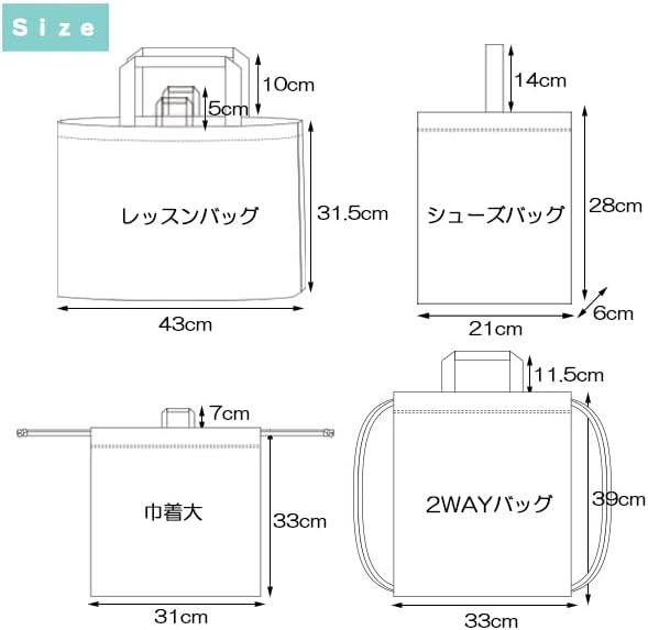 サイズ レッスンバッグ:約W43 H31.5cm、シューズバッグ:約W21 H28 D6cm、2WAYバッグ:W33 39cm、巾着大:W31 H33cm *すべて平置きのサイズ