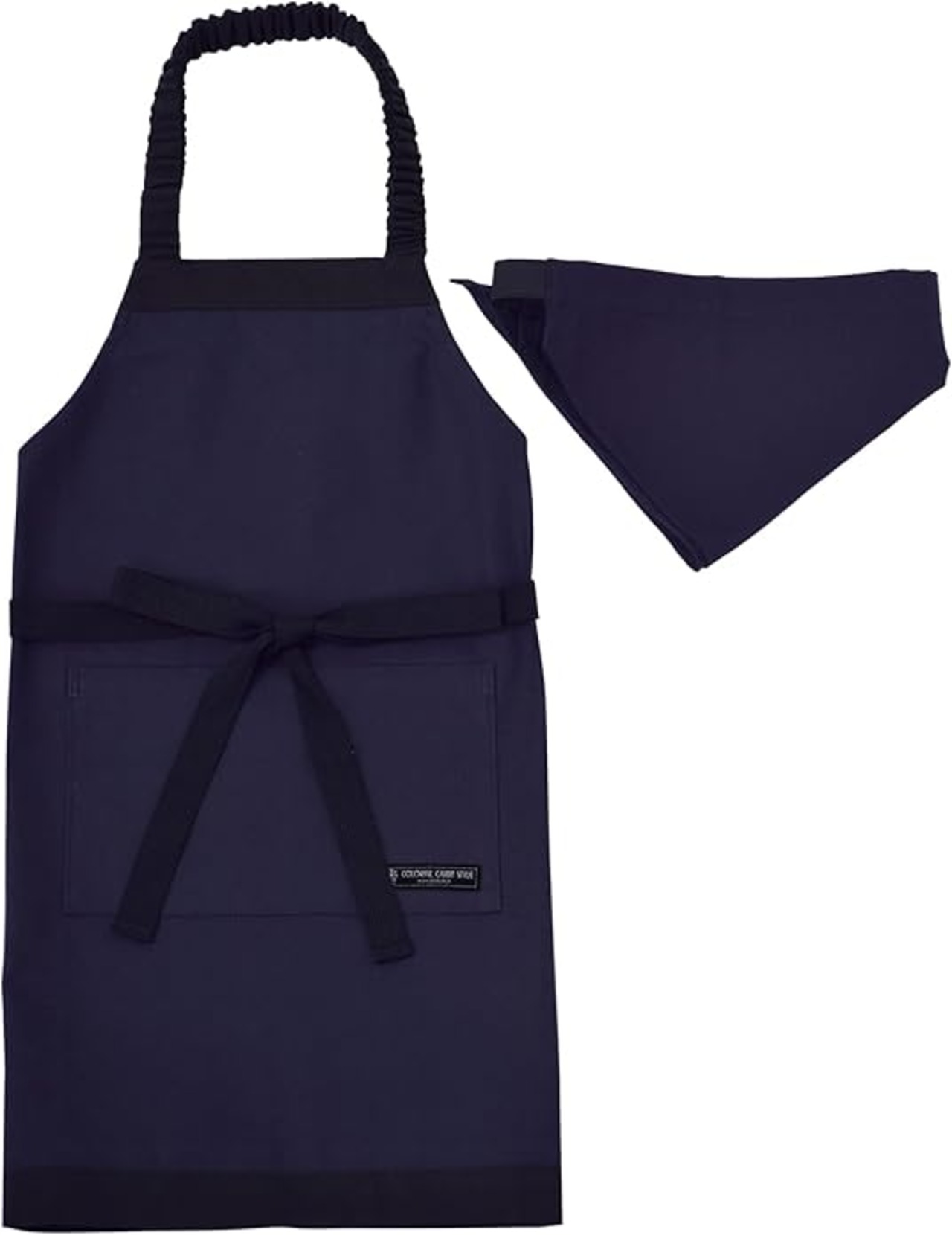 エプロン130-160cm:子どもの成長に対応できる130-160cmサイズ。首ひもの長さを調節できるので、丈の長さを子どもの身長に合わせて変更可能。すっぽりかぶれる首ひも、さらに腰ひもは前で結べるタイプ。ひも結びの練習にもなります。首ひも部分は肌当たりがよく、丈夫なオックス生地を使用。一人で簡単にかぶれるおそろいの三角巾付き。三角巾の後ろはずり落ちにくいゴム仕様。