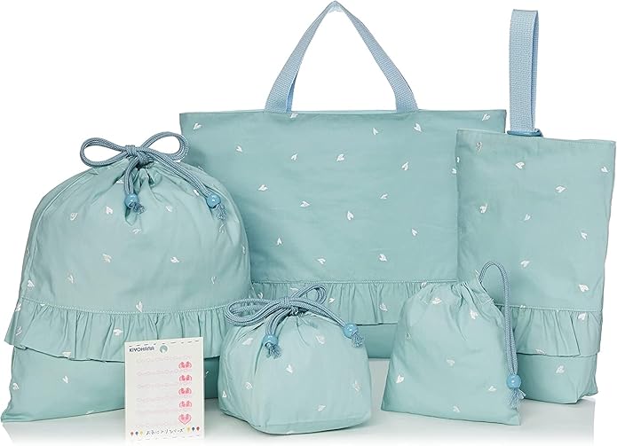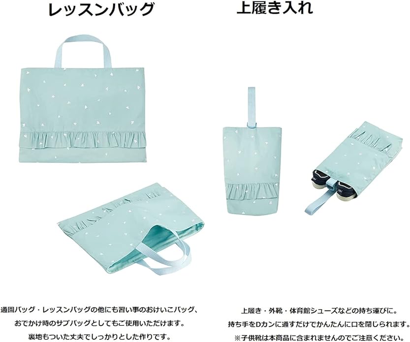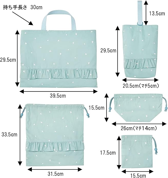 セット内容(サイズ):レッスンバッグ(横約39.5cm 縦約29.5cm 持ち手長さ約30cm)・上履き入れ(横約20.5cm 縦約29.5cm マチ約5cm 持ち手高さ約13.5cm Dカン幅約25mm)・体操着袋(横31.5cm 縦約33.5cm)・お弁当袋(横約26cm 縦約15.5cm マチ約14cm)・コップ袋(横約15.5cm 縦約17.5cm)・お名前シール 5枚/アイロン接着(1枚あたり 横約6cm 縦約1.9cm)