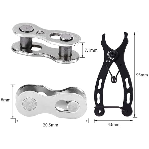 バイクチェーンコネクタ仕様:6/7/8 スピードチェーン、ユニバーサルチェーンコネクタ、重量2.6gペア、数量5ペア。自転車チェーンプライヤー長さ93mm、幅43mm、重さ52g。