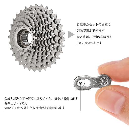 使用回数:不適切なピンの取り付けによって引き起こされるリンク切れやチェーンの破損は避けてください。 使用回数に限りがありますので、5回以内の取り外しと取り付けをお勧めします。