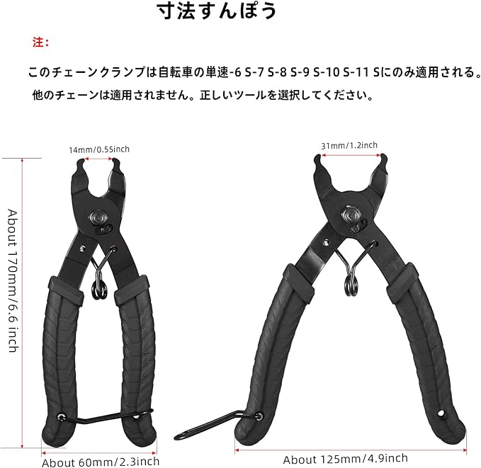 1.ミッシングリンク 工具; 自転車チェーン取外し鉗子は自転車チェーンの交換工具であり、5速6速7速8速9速10速11速12速の自転車チェーンにしか適しておらず、単速自転車チェーンには適しておらず、グリップはゴム被覆、滑り止めパターン設計である。鉗子には良質のスプリングが付いており、チェーンを取り外すのがより便利で迅速である。注意:自転車チェーンでのみ使用でき、他の乗り物チェーンでは使用できません