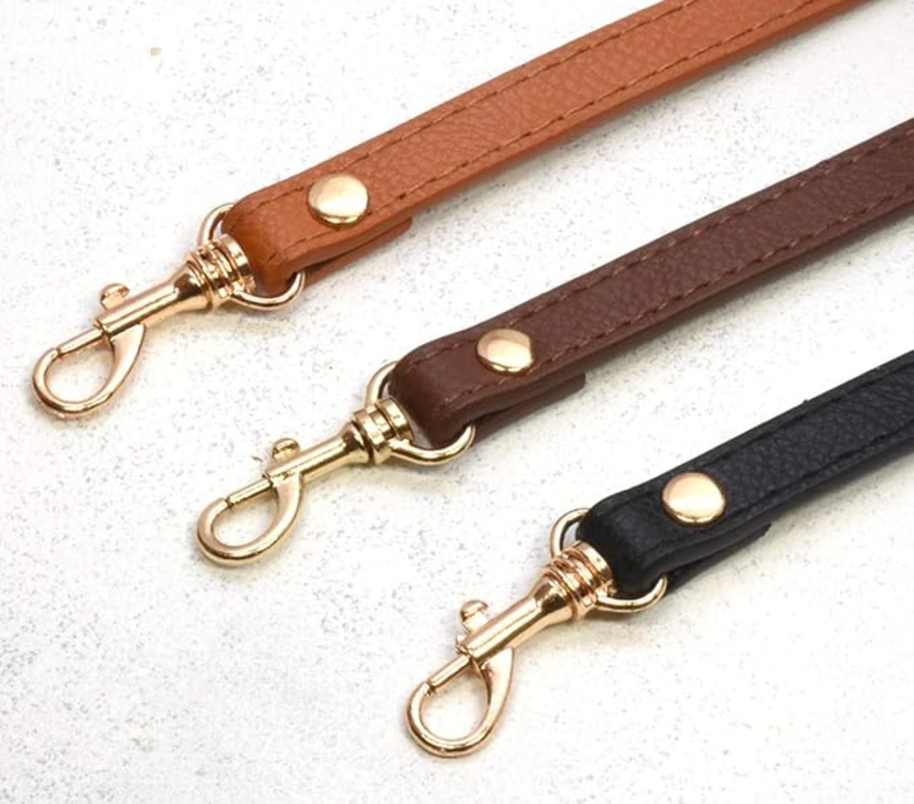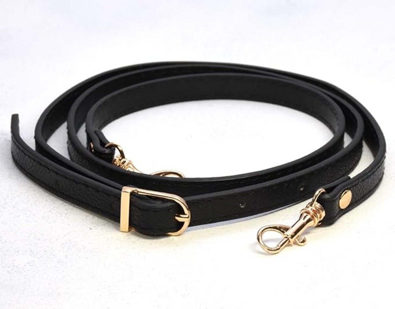 各種のショルダーバッグ製作用のPUレザー製ショルダーストラップ 3本セットです。全長はおよそ109~120cmで3cmごとに調節可能です。幅は約12mm、重さは約42gです。ゴールドのナスカンとバックルを装着しています。ナスカンはディテールが多少異なるものが混在していることがありますのでご了承ください。
