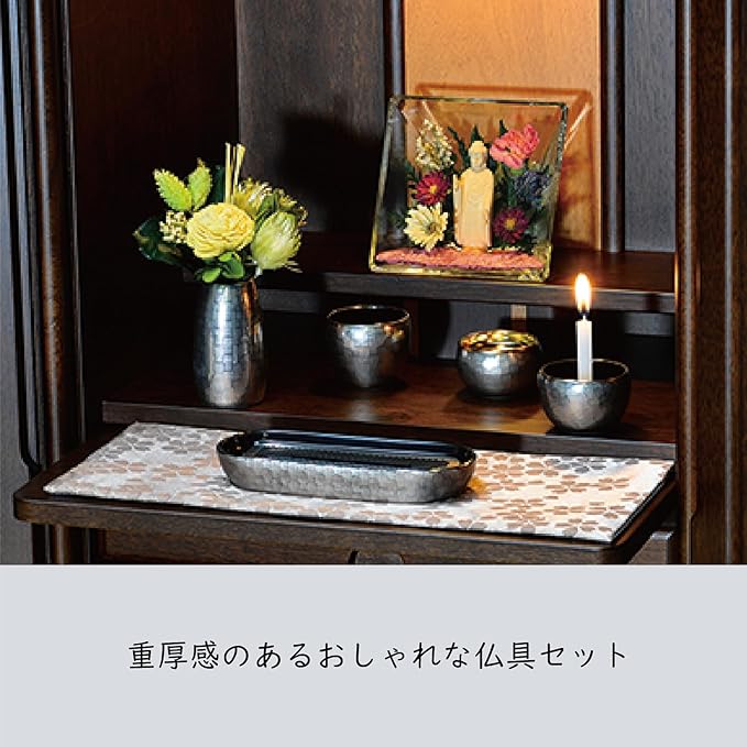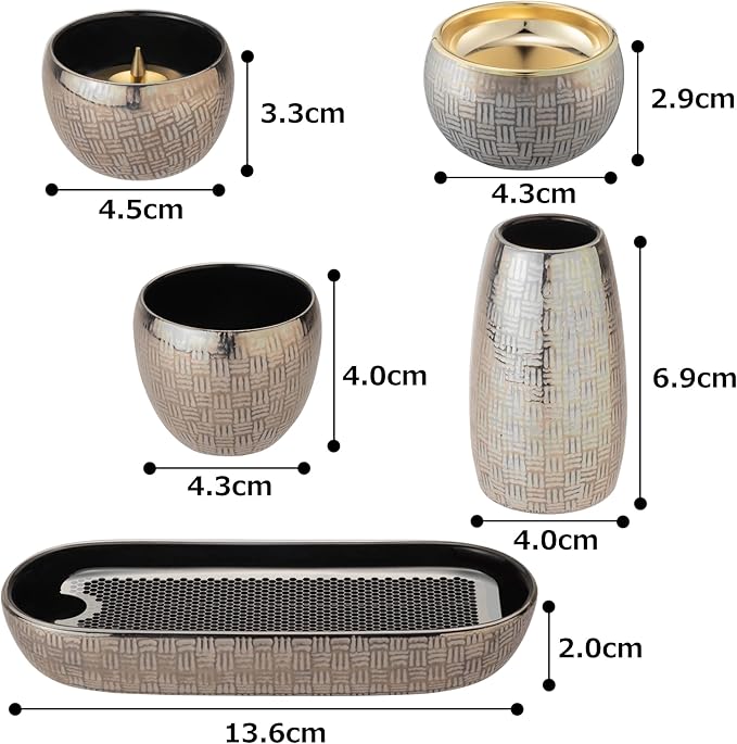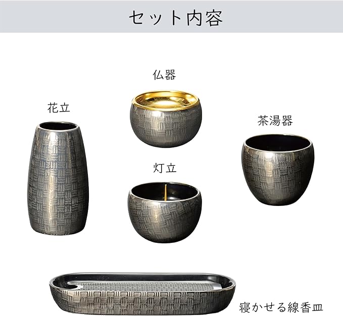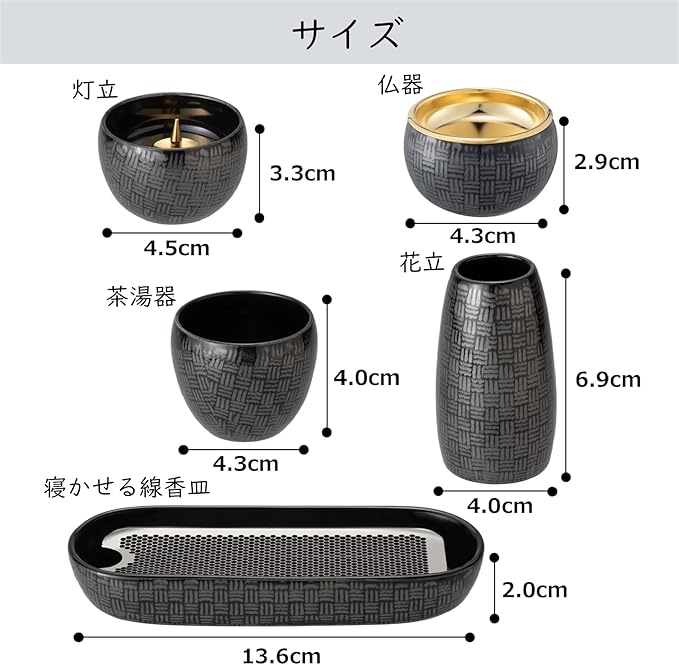 [サイズ]花立:40 40 69、灯立:45 45 33、寝かせる線香:62 136 42、茶湯器:43 43 40、仏器:43 43 29、 本体全重量:約529g