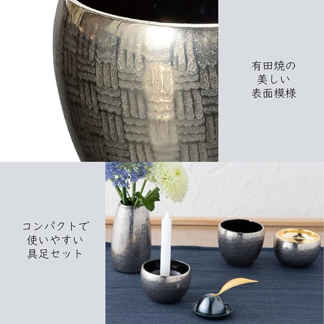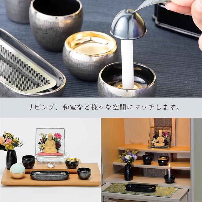 ミニサイズの、おしゃれでモダンな仏具です。お手持ちのマッチ消しや供物台、香炉や高月、おりんなどとも合わせやすいデザインとなっております。