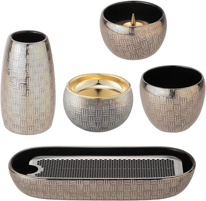 サンメニー 和 モダン 仏具 5点セット 本格 有田焼 日本製 インテリアに馴染む おしゃれ お花 ろうそく 線香 お茶 ご飯 現代仏壇 お仏壇 仏具小物 篭 市松模様 シルバー フラワースタンド キャンドルスタンド インセンスホルダー タンブラー コンパクト 小さい 小物 有田焼(陶器) 仏具セット 花立 灯立 香炉 茶湯器 仏器 [Sunmany]