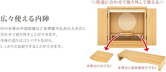 取り外し可能な須弥壇やスライド式仏具板を完備し機能も充実しており、現代の住宅事情にとても適しています。