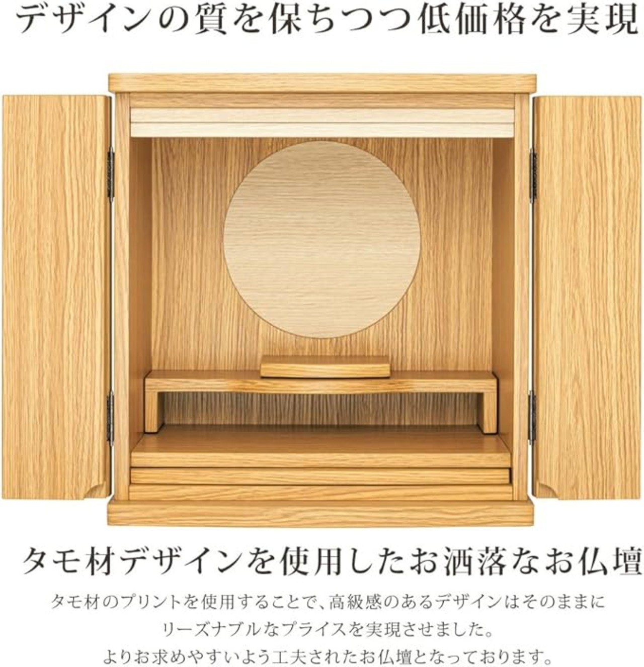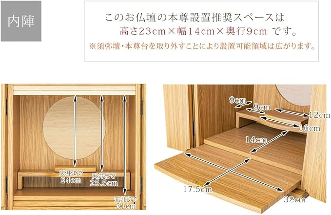 「正面表面材」台輪正面表面材:木目シート貼り、戸板正面表面材:木目シート貼り 「主芯材」MDF 「表面仕上げ」ウレタン仕上げ 「機能・収納」 取り外し式本尊台 / 取り外し式須弥壇 / スライド式仏具板