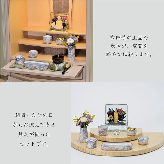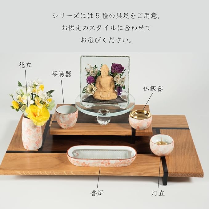 花立、灯立、寝かせる線香皿、茶湯器、仏器がセットになっています。おりんや香炉など、同一の柄のシリーズも取り揃えているため、統一感のあるお仏壇を演出できます。