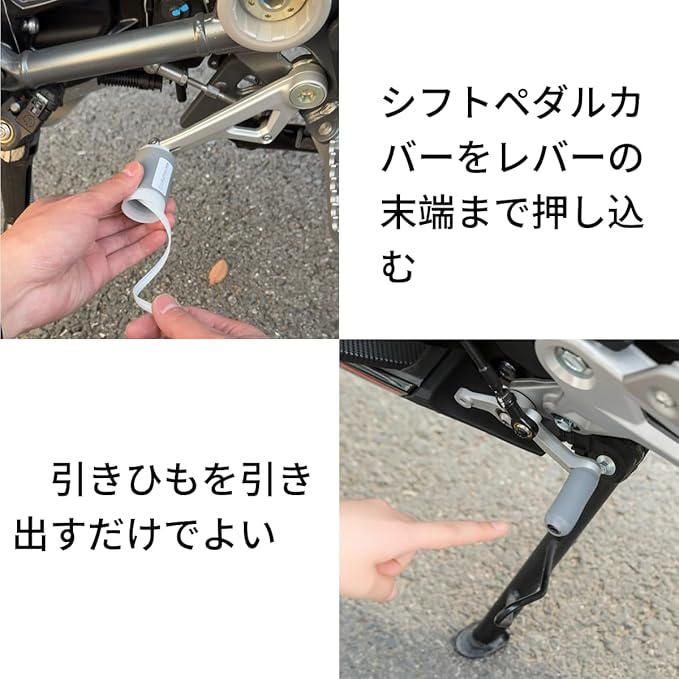 取付簡単:レバーペダルカバーは蓋を外部からシフトペダルの先端に軽く被せるだけで、ワンタッチで取り付けが可能です。工具不要で瞬時に密着し、激しいシフト操作時でも安定性を維持します