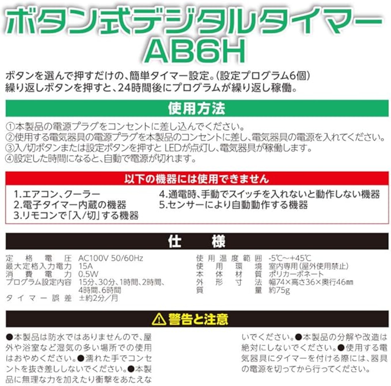 オーム電機 ボタン式デジタルタイマー タイマーコンセント AB6H HS-AB6H 04-8883