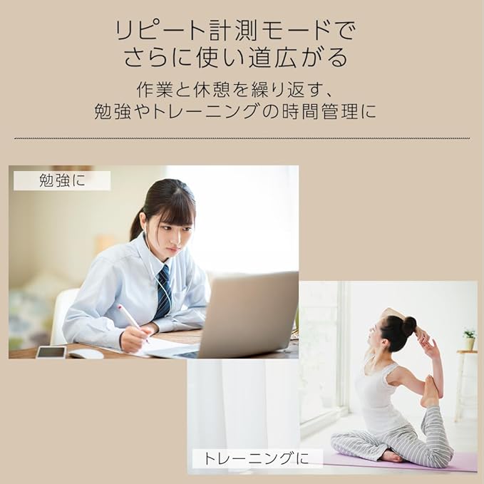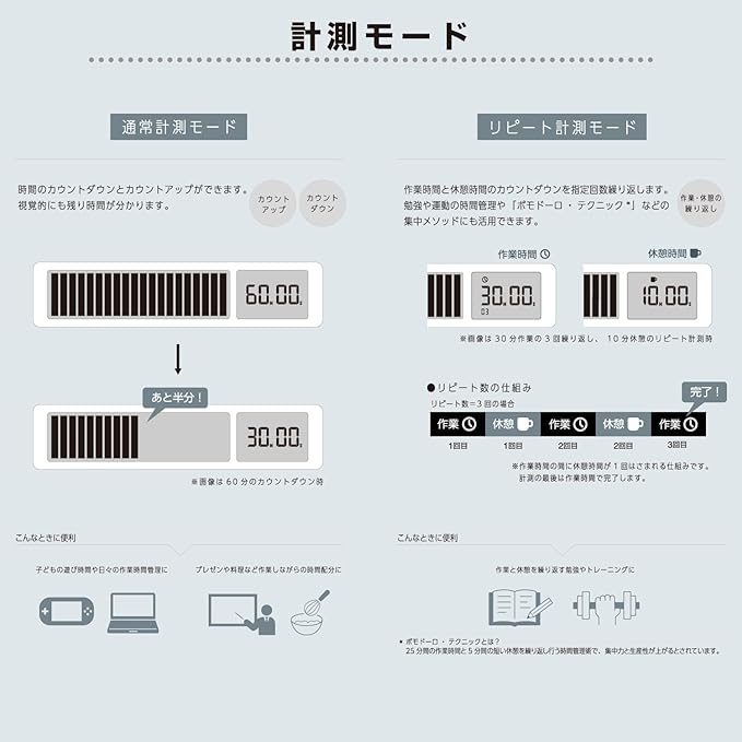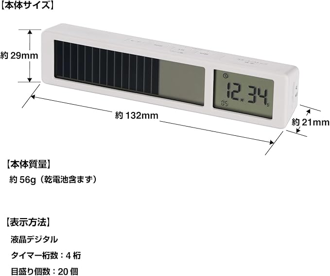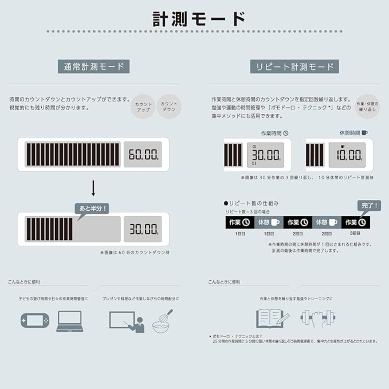 表示方法:液晶デジタル/タイマー桁数:4桁/目盛り個数:20個/【タイマー】(通常計測)カウントダウン:最大計測時間99分50秒、カウントアップ:最大計測時間99分59秒(リピート計測)カウントダウン:最大計測時間99分50秒、リピート数(作業時間)最大99回/(休憩時間)最大98回/【アラーム作動時間(※消音切り替え可能)】(通常計測)約10秒、(リピート計測)計測切り替わり時:約3秒・・計測完了時:約10秒/電源:単4形アルカリ乾電池 2本(別売)/電池寿命:約2年間(1日10秒 3回アラーム作動時)※使用状況により異なります/動作環境:温度5~35℃ 湿度30~80%(非結露)/外寸:約132(W) 21(D) 29(H)mm/質量:約56g(乾電池を含まず)/セット内容:VBT10 本体/ 取扱説明書(保証書付)/屋内専用です。屋外で使用しないでください。/防水・防塵仕様ではありません。/本製品は日本国内専用です。This product is for use only in Japan./直接日光の当たる場所や、高温・多湿の場所での使用または保管はしないでください。