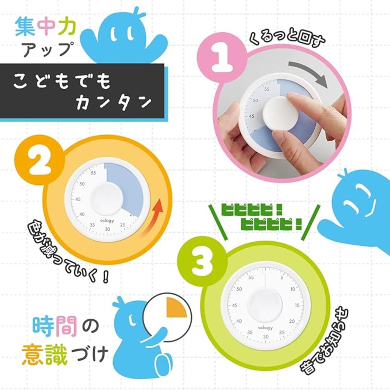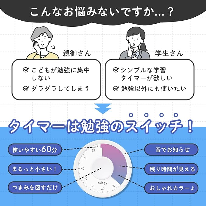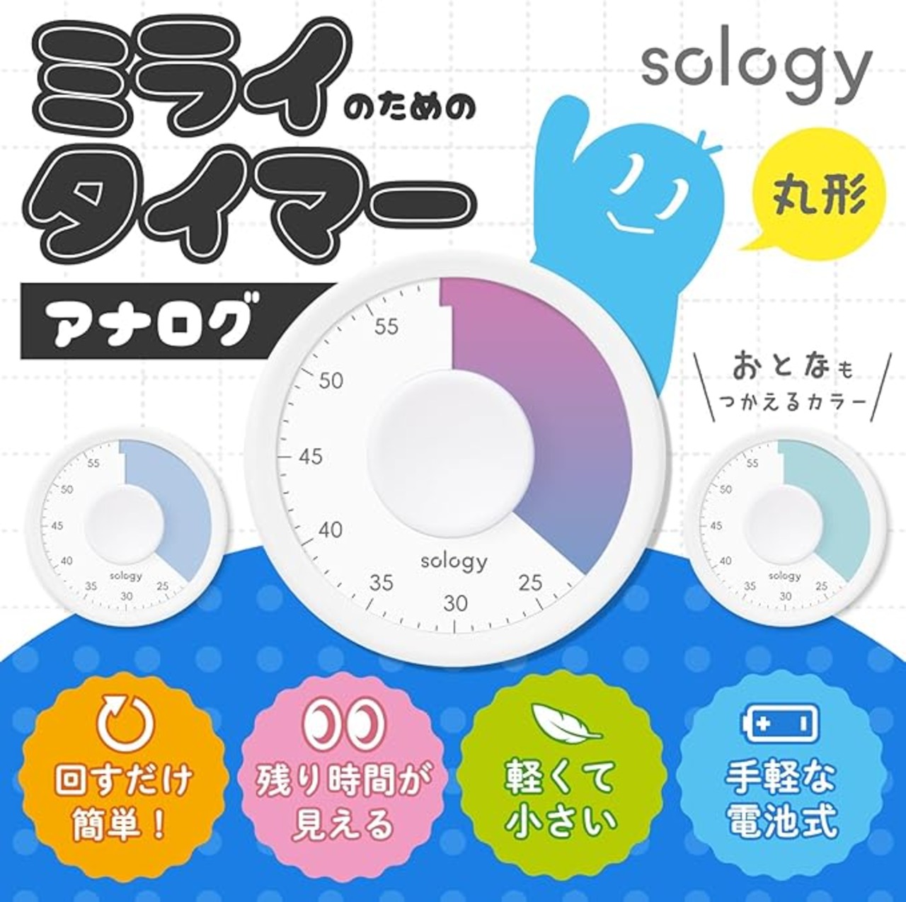 sology(ソロジー) 勉強タイマー MIRAI TIMER 丸型 残り時間が見える 学習タイマー 勉強 料理 ミーティング タスク管理 フィットネス 筋トレ 卓上 かわいい おしゃれ ブルー