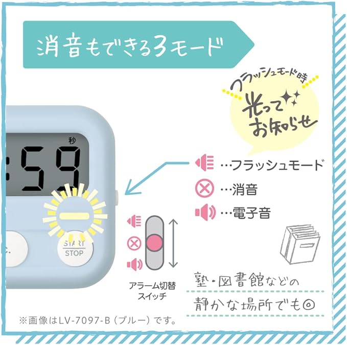 アラームは3モード。フラッシュモード時は光ってお知らせ。カフェや図書館など音が鳴ってほしくない場所でも使えます。