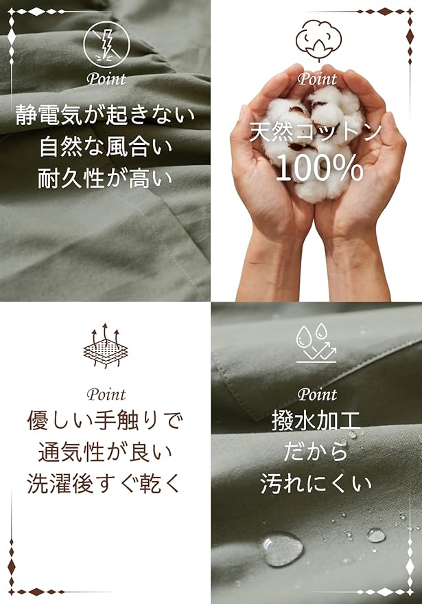 【100%天然素材】軽くて柔らかいふんわりしたコットン生地なので、着心地がよく長時間の着用でも肩こりがしにくいです。撥水加工を施しているので、自然素材の優しい肌触りを保ちつつ、日常のちょっとした水分や汚れを弾きます。ペラペラすぎず、厚すぎないサラッとした手触りで洗濯しても乾きやすいです。