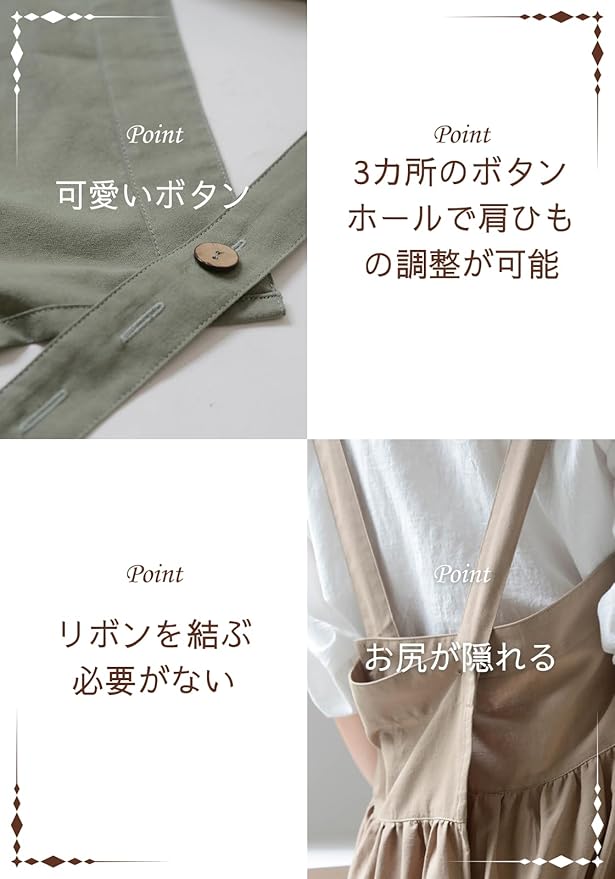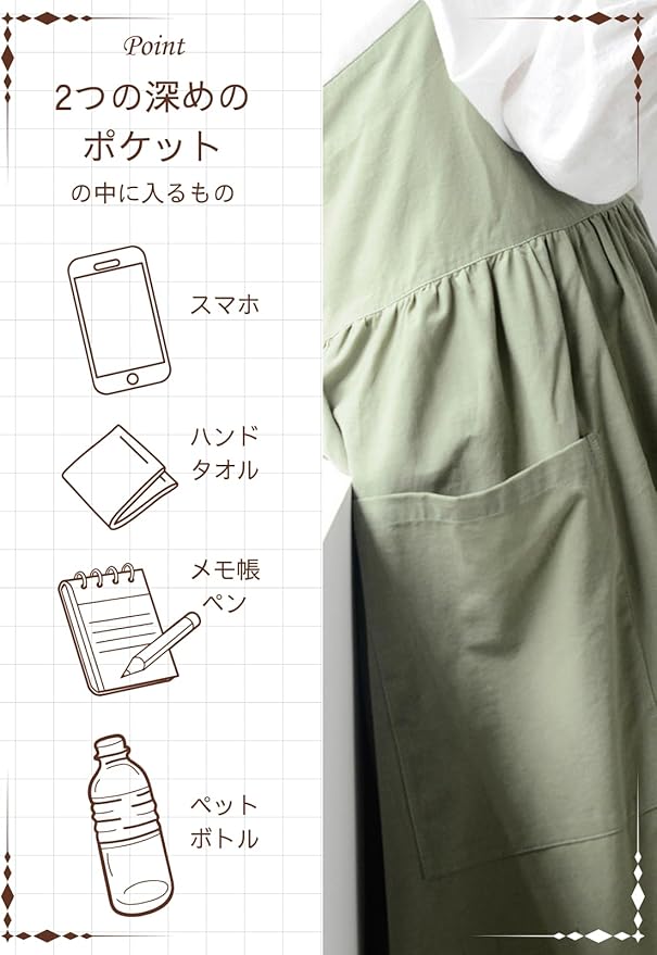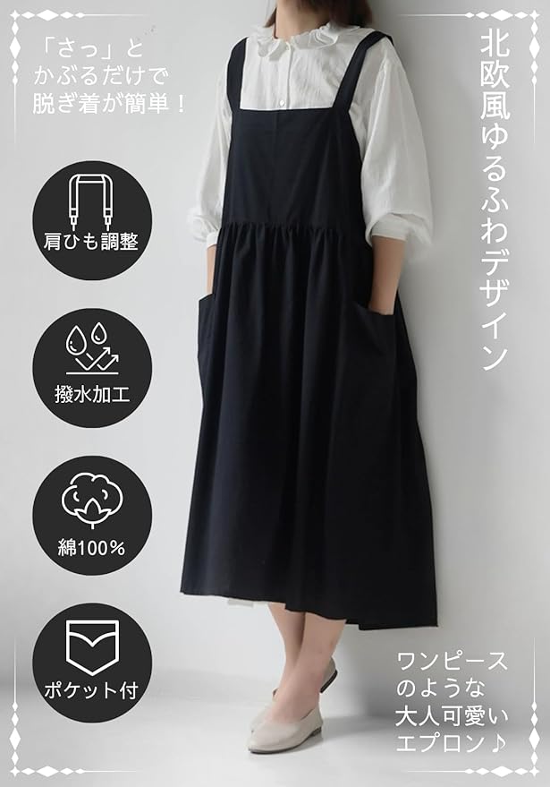 【脱ぎ着がラク】かぶるだけなので、忙しい時も脱ぎ着がラクです。ゆったりしているので、締め付け感やしゃがみにくさもなく、しかも全体をカバー出来るので、体型が気になる方にもおすすめです。身長に合わせて肩ひもの長さを調節でき、左右にポケットがあるので、ハンカチやスマートフォンなどが入れられて便利です。