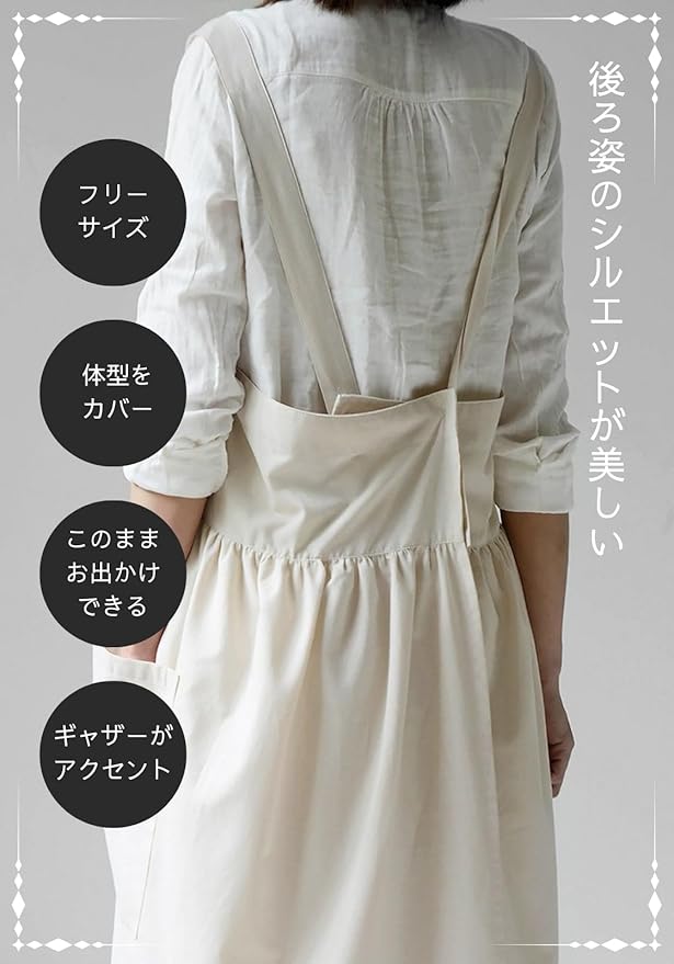 【幅広い用途】料理や家事などの普段使いから、ガーデニングやDIY、カフェや飲食店、保育園など幅広く活躍します。洗濯後、乾きやすいのでお手入れも簡単です。袖Tシャツからニットを着用する際も季節を問わず心地よく使えます。