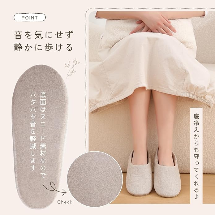 【静かに歩ける】底面はスエード素材なのでパタパタ音を軽減します