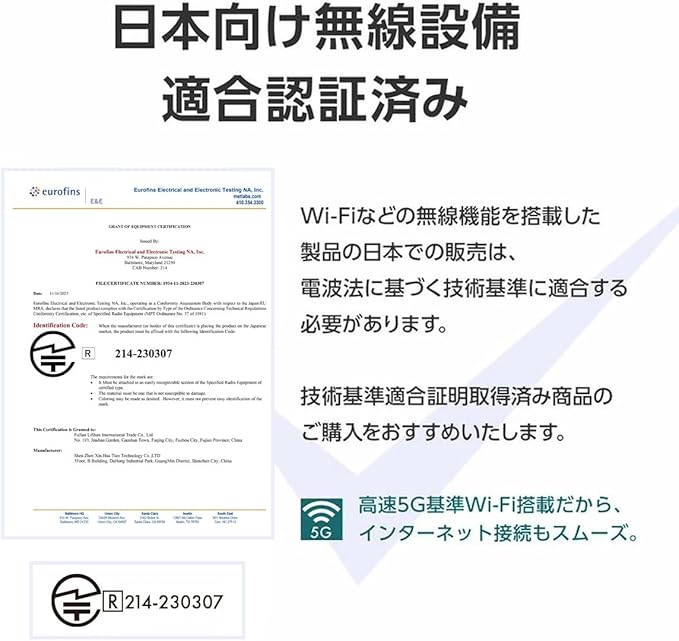 日本向け無線設備適合認証済みで、 高速5GWi-Fi搭載だから、インターネット接続もスムーズに