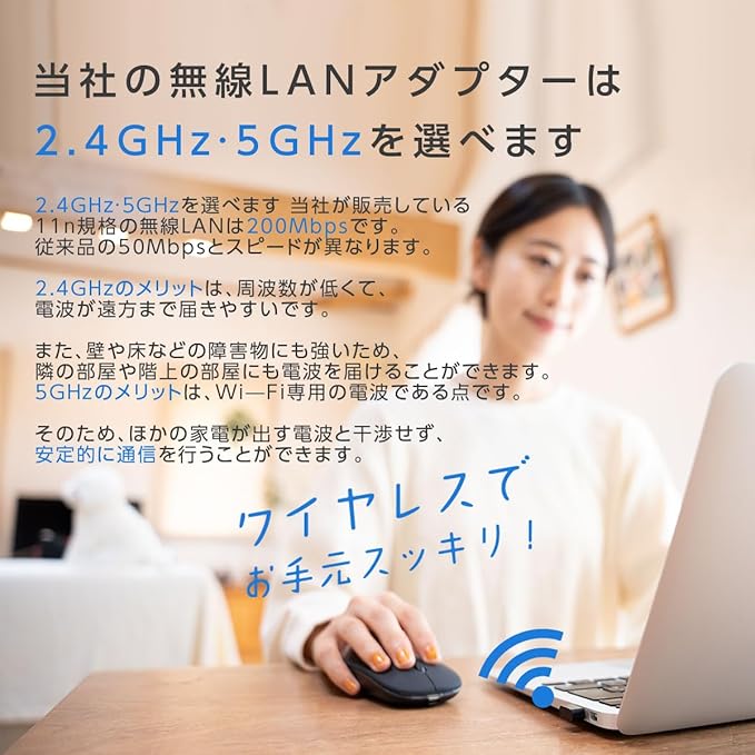 2.4GHzと5GHz対応できます。 2.4GHzは、電波が遠方まで届きやすく、壁や床などの障害物にも強いです。 5GHzは、他の家電が出す電波と干渉軽減、安定的に通信を行うことができます。