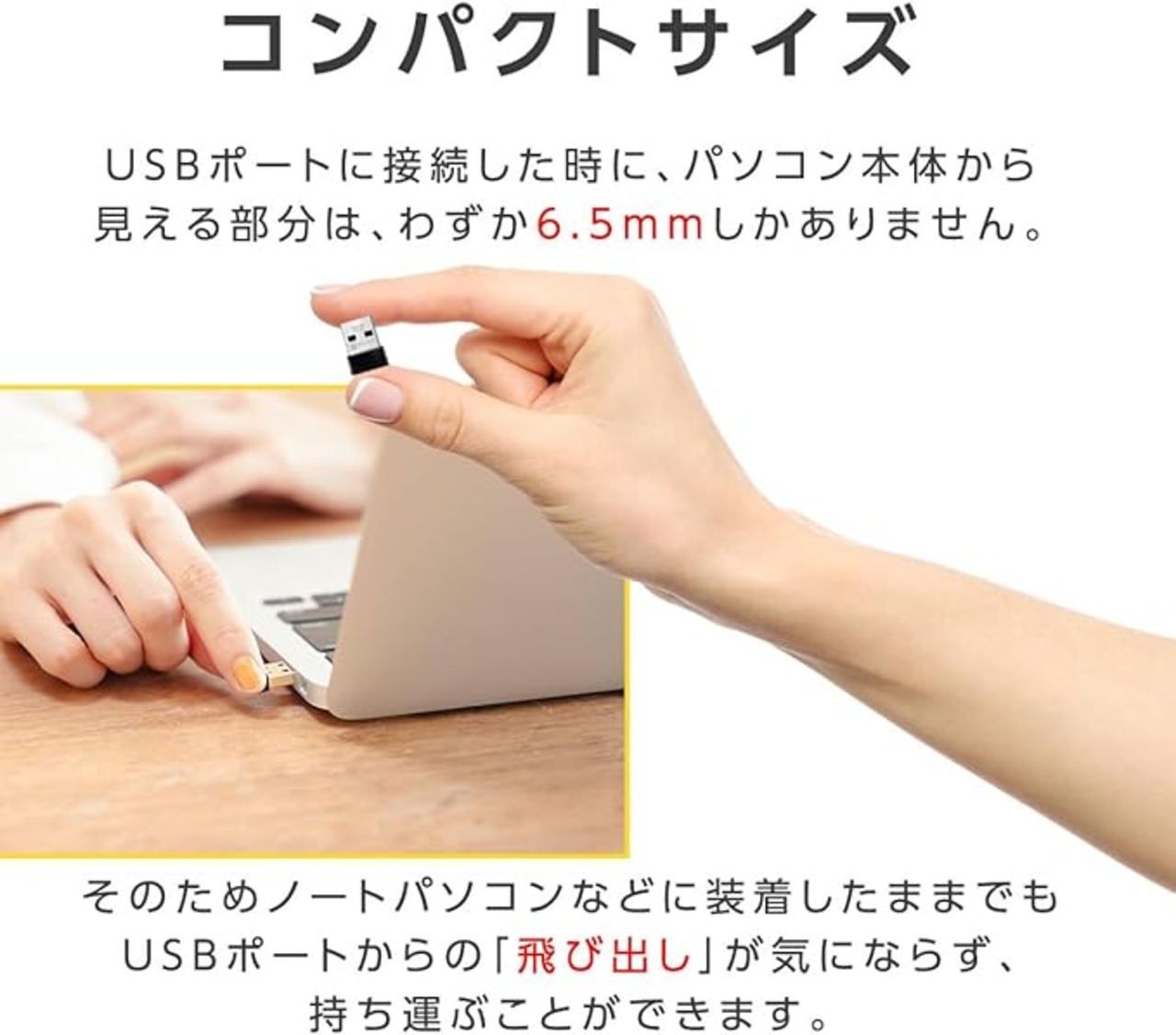 コンパクトサイズ ノートパソコンなどに装着したままでもUSBポートからの「飛び出し」が気にならず、持ち運ぶことができます。