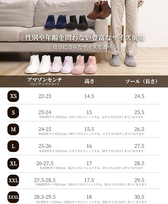 【着用モデルのサイズ】●[A女性モデル]足サイズ 22.5cm S着用;●[B女性モデル]足サイズ 23.5cm M着用;●[C女性モデル]足サイズ 24cm L着用;●[D女性モデル]足サイズ 24.5cm L着用;●[A男性モデル]足サイズ 25cm L着用;●[B男性モデル]足サイズ 26cm XL着用。●[C男性モデル]足サイズ 26.5cm XXL着用。