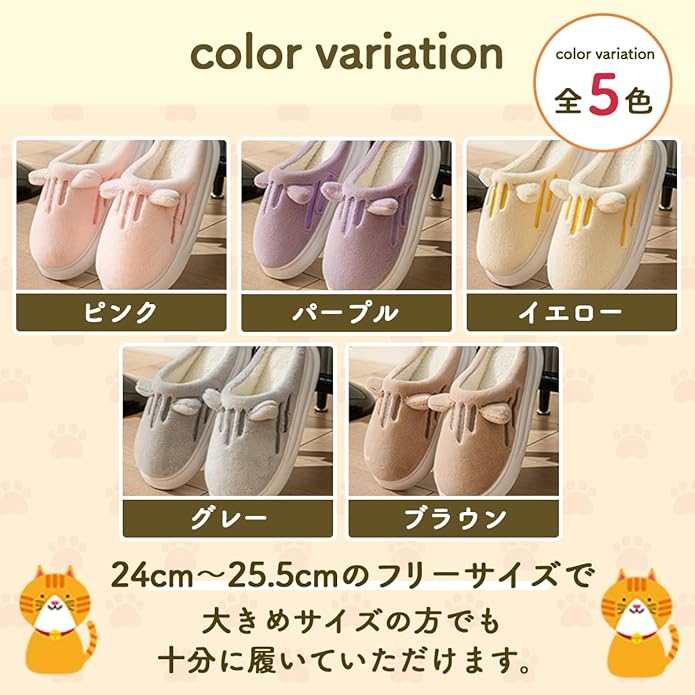 ✅【フリーサイズ】サイズは24~25.5cmのフリーサイズ。おしゃれで心地良い室内スリッパです。可愛い猫ちゃんに癒されるお家時間をぜひ。