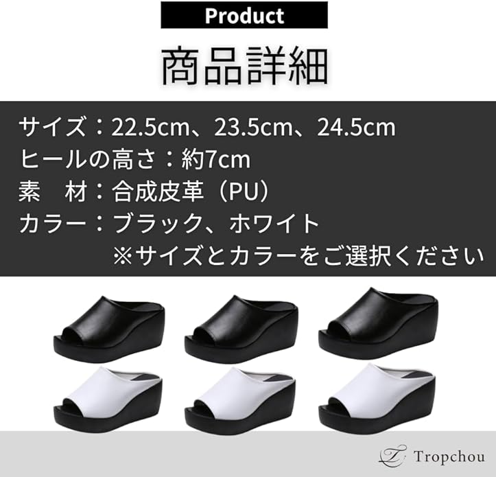 【商品仕様】 サイズ:22.5cm、23.5cm、24.5cm ヒールの高さ:約7cm カラー:ブラック、ホワイト 素材:合成皮革(PU) ※サイズとカラーをご選択ください