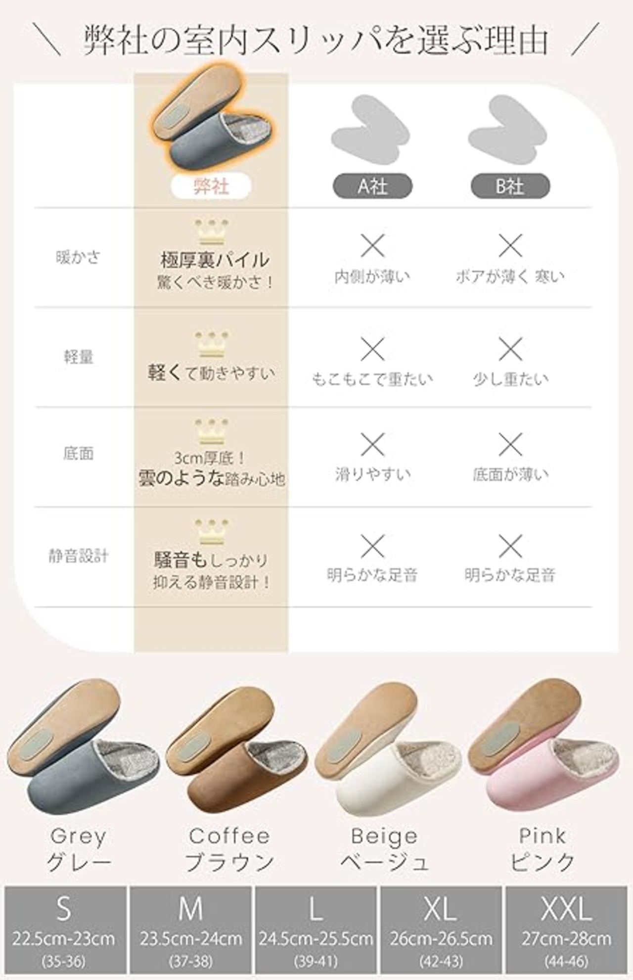 【二重の検品体制・日本人向けにサイズ展開】日本人一般的なサイズ感を徹底的に調査して開発しました。S:22.5-23(35-36),M:23.5-24(37-38),L:24.5-25.5(39-41),XL:26-26.5(42-43),XXL:27-28(44-46)※工場での検品だけでなく、販売前に再度別の場所で検品を行い、2重の検品体制を取って不良品を排除。一品一品問題がないか検品しています。購入後、万が一サイズが合わない場合やご満足いただけない場合は、返品・交換または全額返金を承りますので、安心してご購入ください。