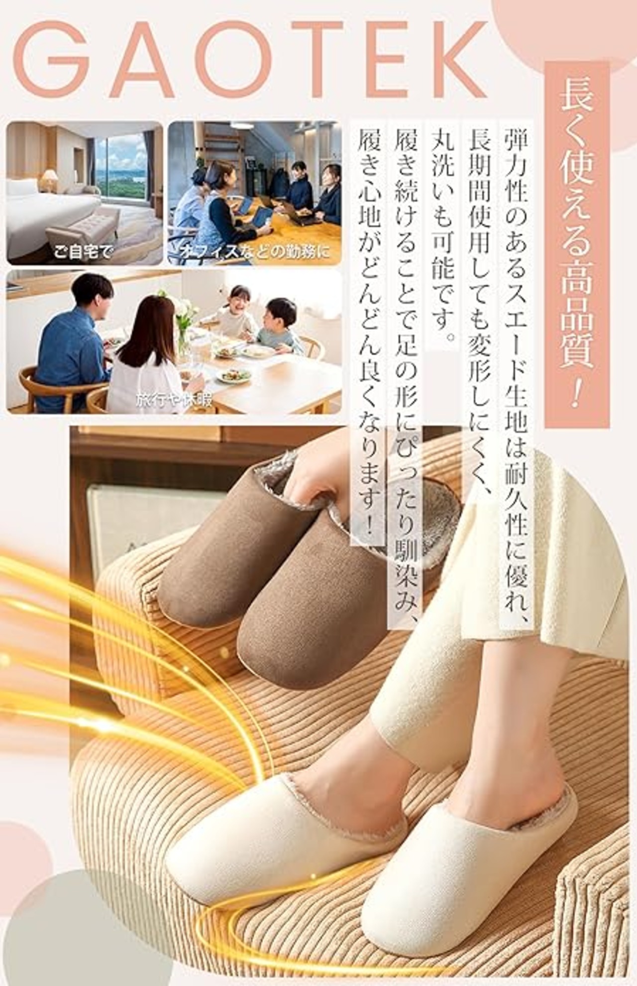 【独特な靴底デザイン:超静音&滑り止め&床を傷つけない】 柔らかいスエード生地を使用した靴底は、驚くほど静音性に優れ、足音を気にせず歩けます。また、床を傷つける心配もありません。さらに、防滑パッド付きで、濡れた床でも滑りにくい仕様。冬の寒い季節でも快適で安全に使える、実用性抜群のスリッパです。