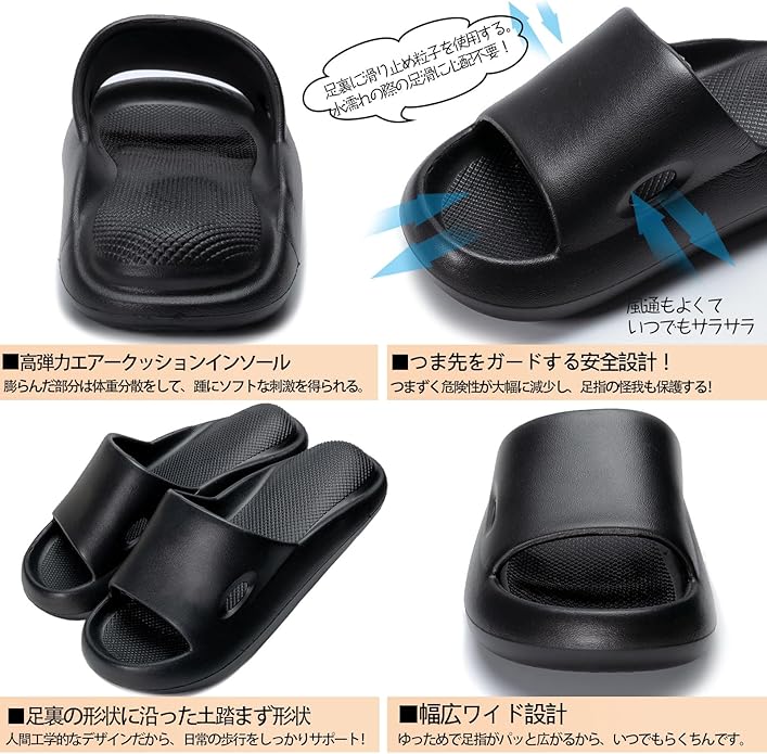 ●【つまずきや滑り止め防止 日常の安全を守る!】フィット性を重視し、サンダルのつま先の方が浮く設計、足裏の形状に沿って土踏まずの形を設計しましたから、足にフィットし、つまずく危険性が大幅に減少します。さらに、足底の表面に滑り止め粒子を使用され、水濡れの際には足が滑る心配がなく、子供からお年寄りの方まで安心して着用できます。